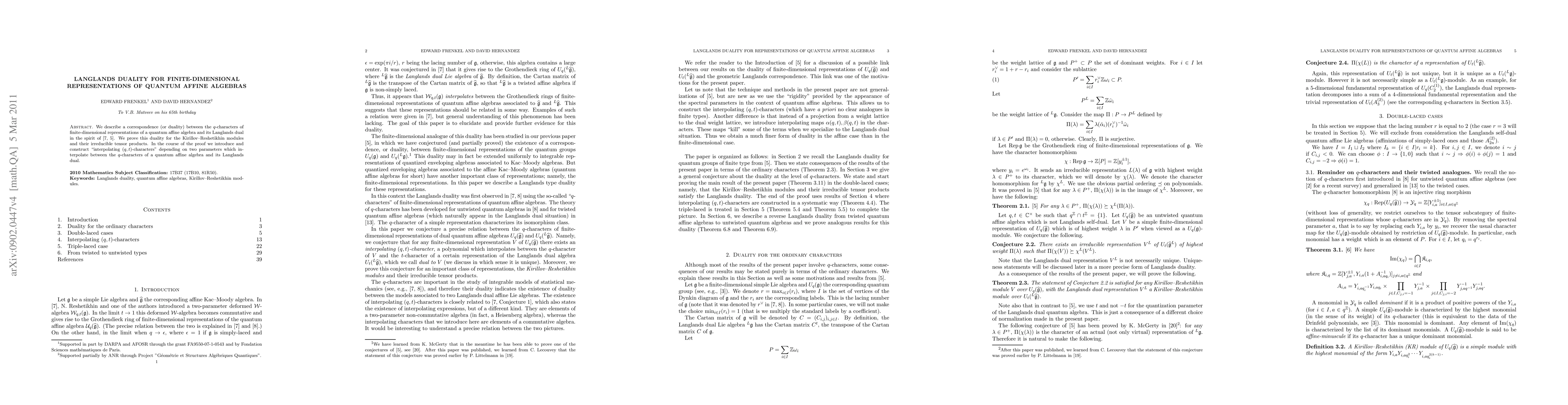 This paper establishes a Langlands duality for finite-dimensional representations of quantum affine algebras, proving the correspondence between their q-characters and those of their Langlands duals. The authors introduce "interpolating (q,t)-characters" to bridge the duality, specifically for Kirillov-Reshetikhin modules and their irreducible tensor products.