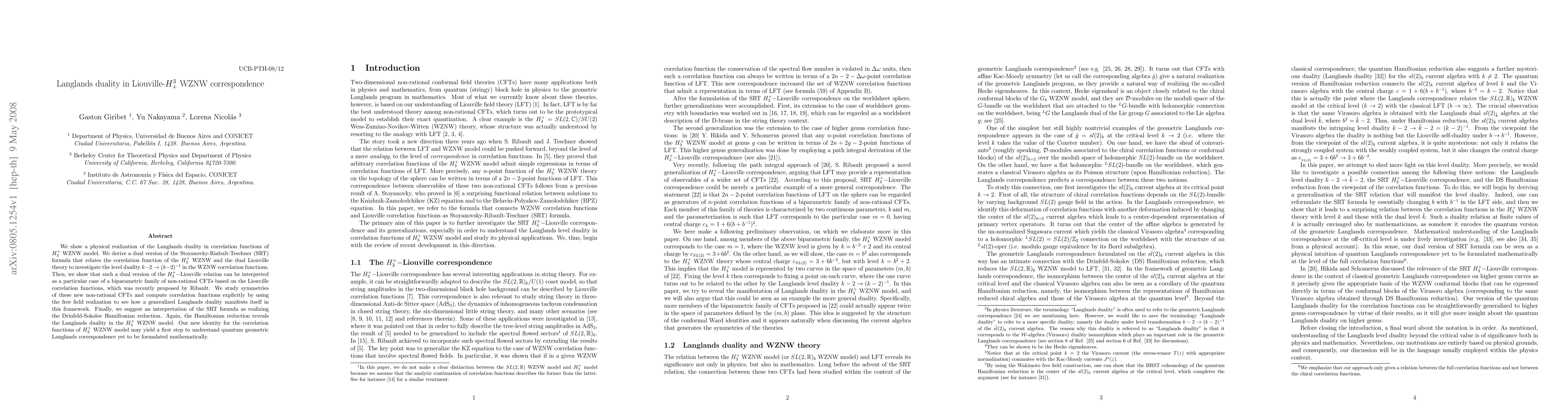 This work is significant as it provides a physical realization of Langlands duality in correlation functions of the H_3^+ WZNW model, potentially contributing to the mathematical formulation of the quantum geometric Langlands correspondence.