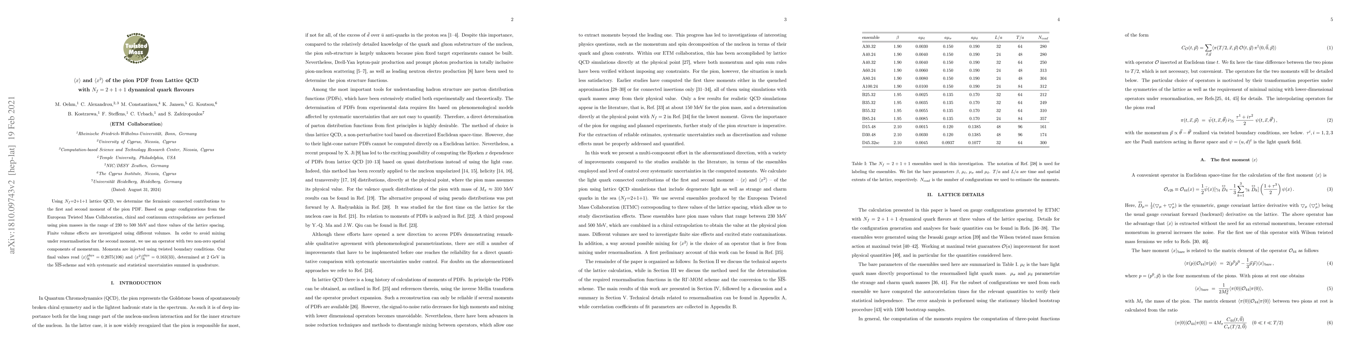 Using Nf=2+1+1 lattice QCD, we determine the fermionic connected contributions to the second and third moment of the pion PDF. Based on gauge configurations from the European Twisted Mass Collaboration, chiral and continuum extrapolations are performed using pion masses in the range of 230 to 500 MeV and three values of the lattice spacing. Finite volume effects are investigated using different volumes. In order to avoid mixing under renormalisation for the third moment, we use an operator with two non-zero spatial components of momentum. Momenta are injected using twisted boundary conditions. Our final values read $\langle x\rangle=0.2075(106)$ and $\langle x^2\rangle=0.163(33)$, determined at 2 GeV in the $\overline{MS}$-scheme and with systematic and statistical uncertainties summend in quadrature.
