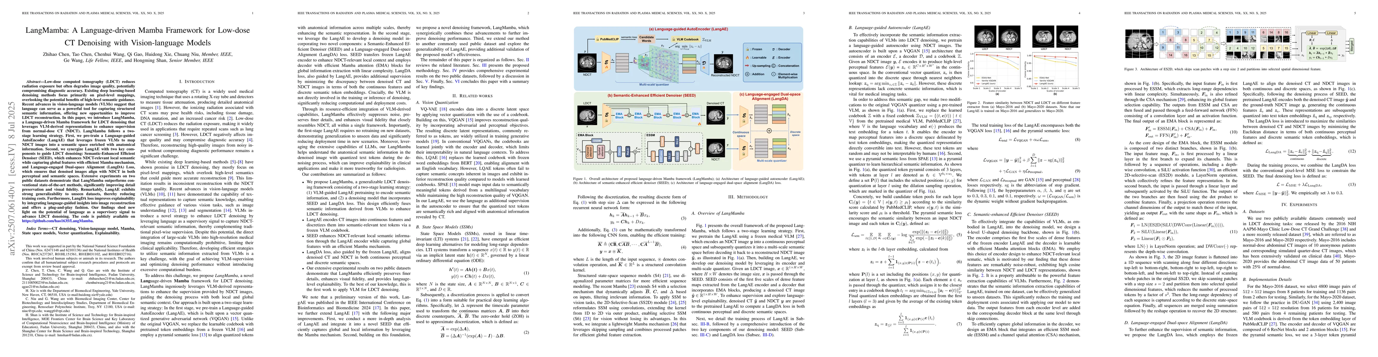 The paper introduces LangMamba, a language-driven framework for low-dose CT (LDCT) denoising, leveraging vision-language models (VLMs) to enhance supervision from normal-dose CT (NDCT). It employs a two-stage learning strategy: pre-training a Language-guided AutoEncoder (LangAE) using frozen VLMs to map NDCT images into a semantic space enriched with anatomical information, and synergizing LangAE with Semantic-Enhanced Efficient Denoiser (SEED) and Language-engaged Dual-space Alignment (LangDA) Loss for LDCT denoising.
