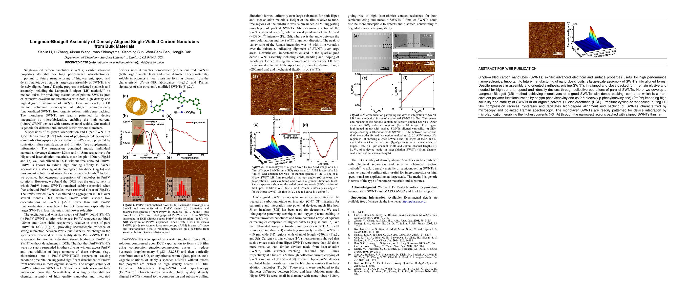 This paper describes a Langmuir Blodgett method to create densely aligned monolayers of single-walled carbon nanotubes (SWNTs) using polymer functionalization, achieving high current densities and enabling advanced nanoelectronic devices. Microscopy and spectroscopy confirm the high alignment and packing of SWNTs, with promising results for future nanotube circuit manufacturing.