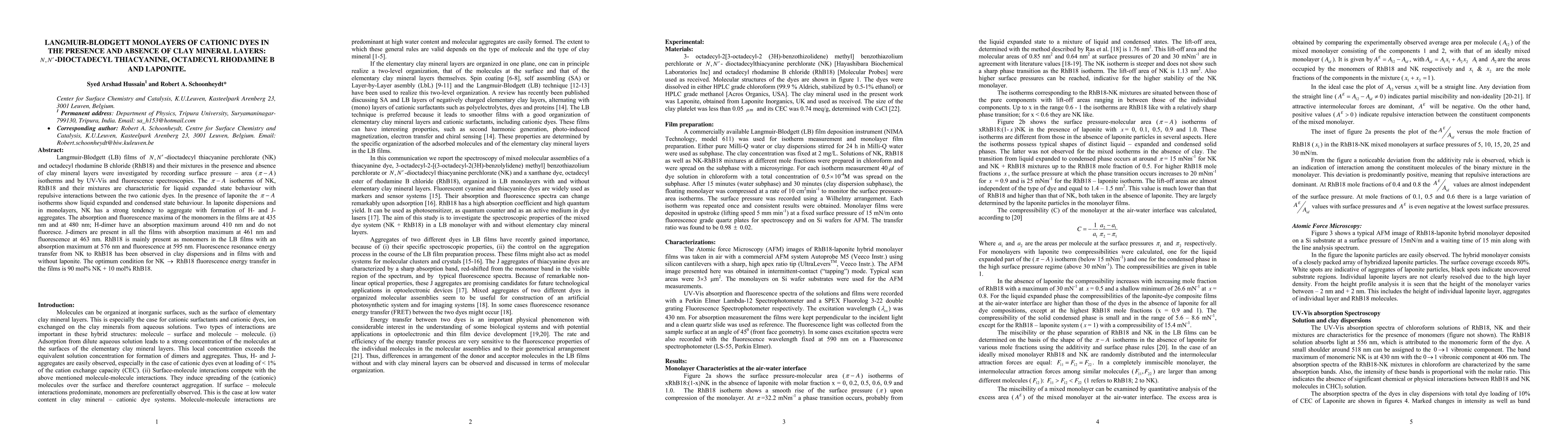 This study investigates Langmuir-Blodgett films of cationic dyes NK and RhB18, with and without laponite, using surface pressure-area isotherms and spectroscopic methods. The presence of laponite induces both liquid expanded and condensed states, and promotes NK aggregation into H- and J-aggregates.