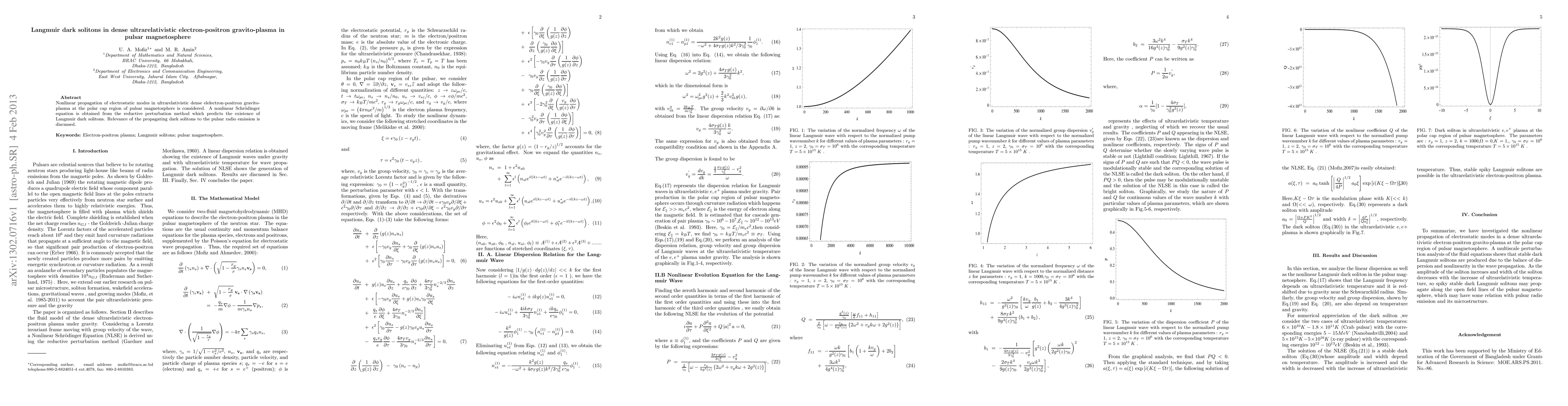 This paper investigates the nonlinear propagation of electrostatic modes in dense ultrarelativistic electron-positron gravito-plasmas in pulsar magnetospheres, deriving a nonlinear Schrödinger equation that predicts the existence of Langmuir dark solitons. The study discusses the potential relevance of these solitons to pulsar radio emissions.