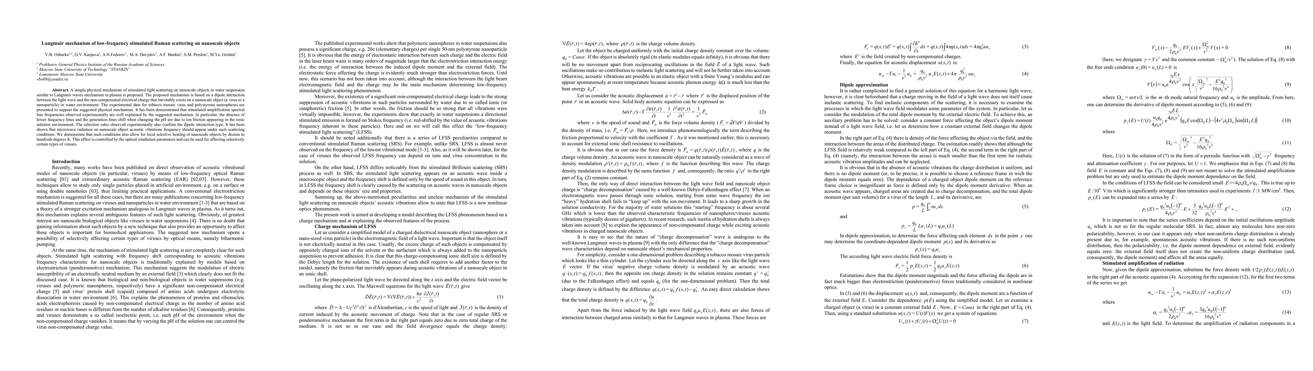 This paper proposes a Langmuir mechanism-like model for low-frequency stimulated Raman scattering on nanoscale objects, attributing it to dipole interactions with non-compensated charges. Experimental data from tobacco mosaic virus and polystyrene nanospheres support the model, demonstrating selective heating and frequency shifts due to ion friction and pH changes.