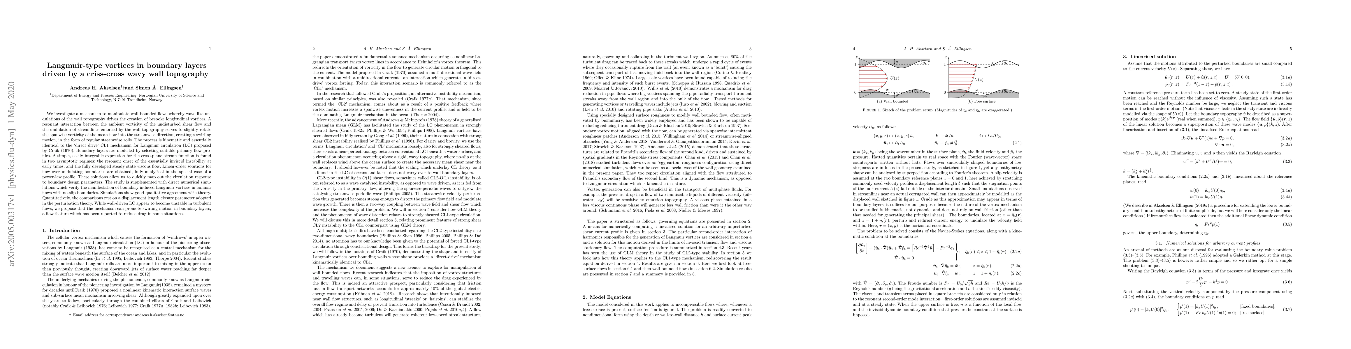 This paper investigates the creation of Langmuir-type vortices in boundary layers driven by criss-cross wavy wall topography, demonstrating a resonant interaction that induces streamwise rolls. Analytical and numerical results show the potential for reducing drag through the promotion of swirling motion in laminar flows.