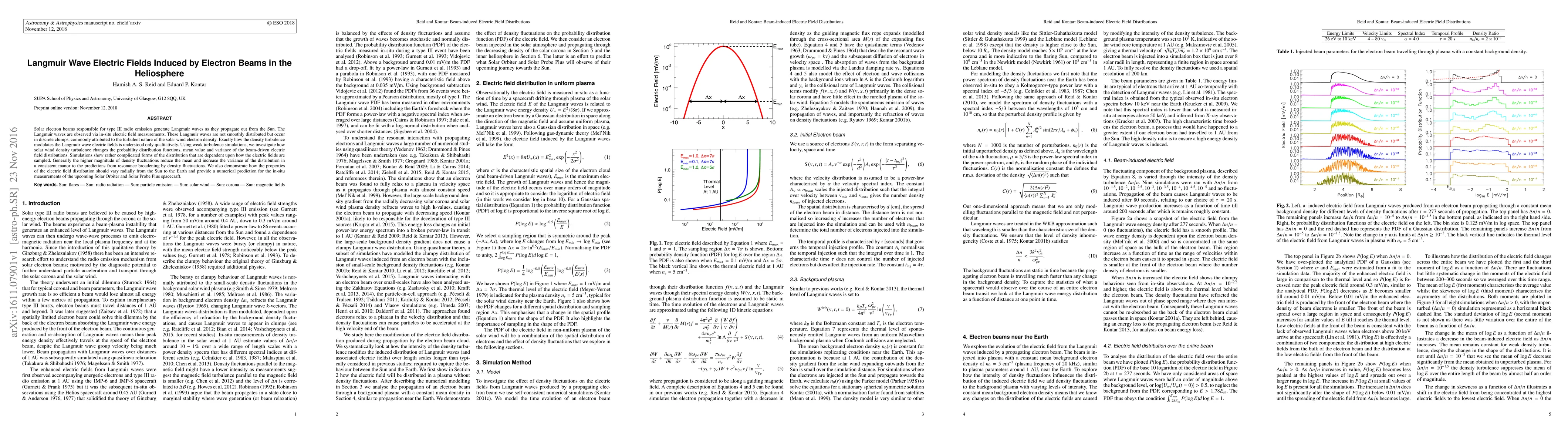 Solar electron beams responsible for type III radio emission generate Langmuir waves as they propagate out from the Sun. The Langmuir waves are observed via in-situ electric field measurements. These Langmuir waves are not smoothly distributed but occur in discrete clumps, commonly attributed to the turbulent nature of the solar wind electron density. Exactly how the density turbulence modulates the Langmuir wave electric fields is understood only qualitatively. Using weak turbulence simulations, we investigate how solar wind density turbulence changes the probability distribution functions, mean value and variance of the beam-driven electric field distributions. Simulations show rather complicated forms of the distribution that are dependent upon how the electric fields are sampled. Generally the higher magnitude of density fluctuations reduce the mean and increase the variance of the distribution in a consistent manor to the predictions from resonance broadening by density fluctuations. We also demonstrate how the properties of the electric field distribution should vary radially from the Sun to the Earth and provide a numerical prediction for the in-situ measurements of the upcoming Solar Orbiter and Solar Probe Plus spacecraft.