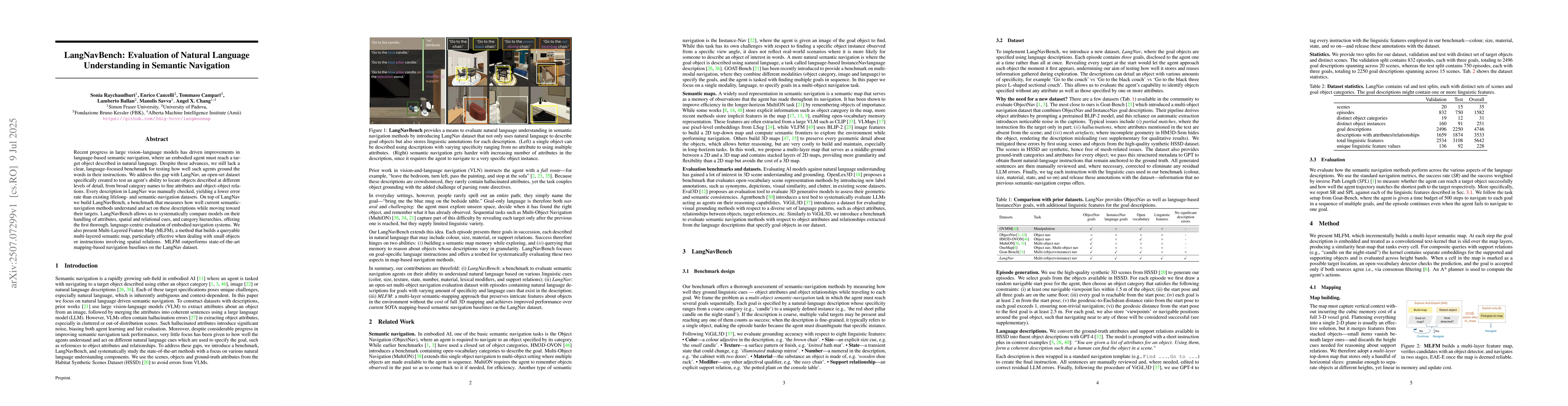 Recent progress in large vision-language models has driven improvements in language-based semantic navigation, where an embodied agent must reach a target object described in natural language. Despite these advances, we still lack a clear, language-focused benchmark for testing how well such agents ground the words in their instructions. We address this gap with LangNav, an open-set dataset specifically created to test an agent's ability to locate objects described at different levels of detail, from broad category names to fine attributes and object-object relations. Every description in LangNav was manually checked, yielding a lower error rate than existing lifelong- and semantic-navigation datasets. On top of LangNav we build LangNavBench, a benchmark that measures how well current semantic-navigation methods understand and act on these descriptions while moving toward their targets. LangNavBench allows us to systematically compare models on their handling of attributes, spatial and relational cues, and category hierarchies, offering the first thorough, language-centric evaluation of embodied navigation systems. We also present Multi-Layered Feature Map (MLFM), a method that builds a queryable multi-layered semantic map, particularly effective when dealing with small objects or instructions involving spatial relations. MLFM outperforms state-of-the-art mapping-based navigation baselines on the LangNav dataset.