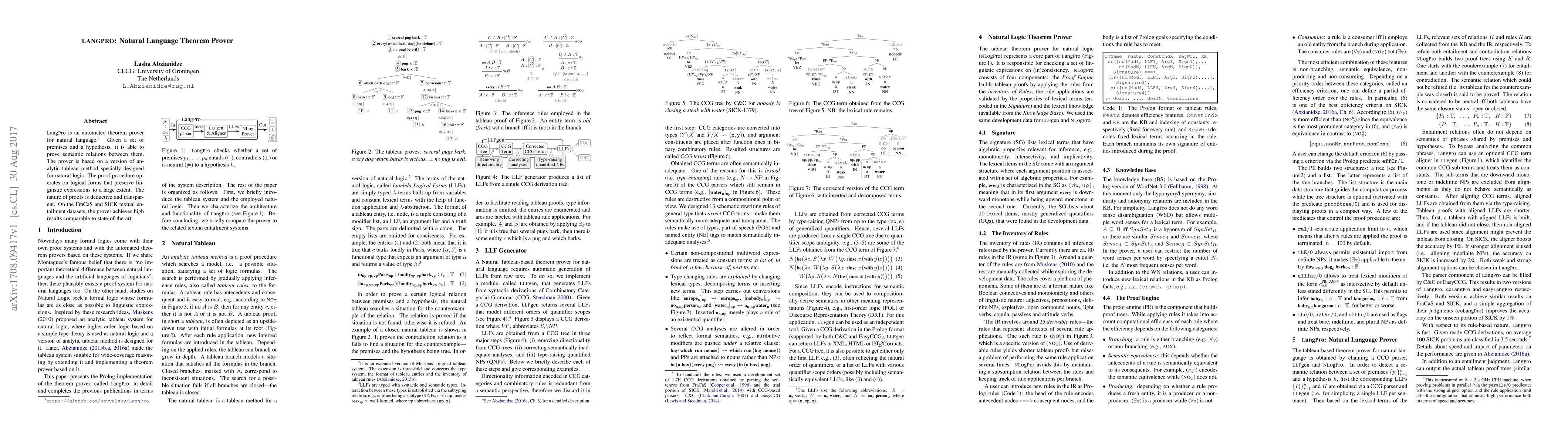 LangPro employs a natural language theorem prover based on an analytic tableau method tailored for natural logic. It operates on logical forms (Lambda Logical Forms or LLFs) derived from syntactic trees, specifically Combinatory Categorial Grammar (CCG) derivation trees, preserving linguistic expressions. The prover uses a version of Muskens' tableau system extended for natural logic, with a typesystem, tableau entry format, and tableau rules adapted for natural logic.