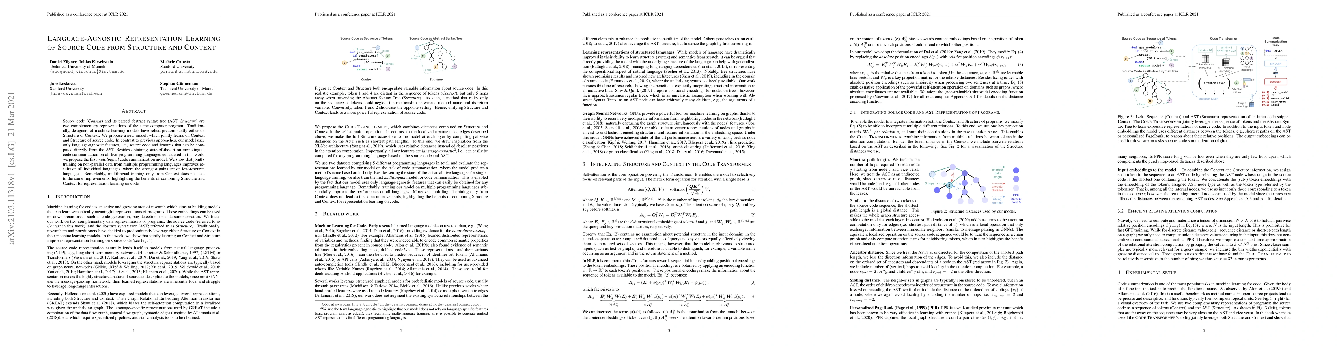 Source code (Context) and its parsed abstract syntax tree (AST; Structure) are two complementary representations of the same computer program. Traditionally, designers of machine learning models have relied predominantly either on Structure or Context. We propose a new model, which jointly learns on Context and Structure of source code. In contrast to previous approaches, our model uses only language-agnostic features, i.e., source code and features that can be computed directly from the AST. Besides obtaining state-of-the-art on monolingual code summarization on all five programming languages considered in this work, we propose the first multilingual code summarization model. We show that jointly training on non-parallel data from multiple programming languages improves results on all individual languages, where the strongest gains are on low-resource languages. Remarkably, multilingual training only from Context does not lead to the same improvements, highlighting the benefits of combining Structure and Context for representation learning on code.