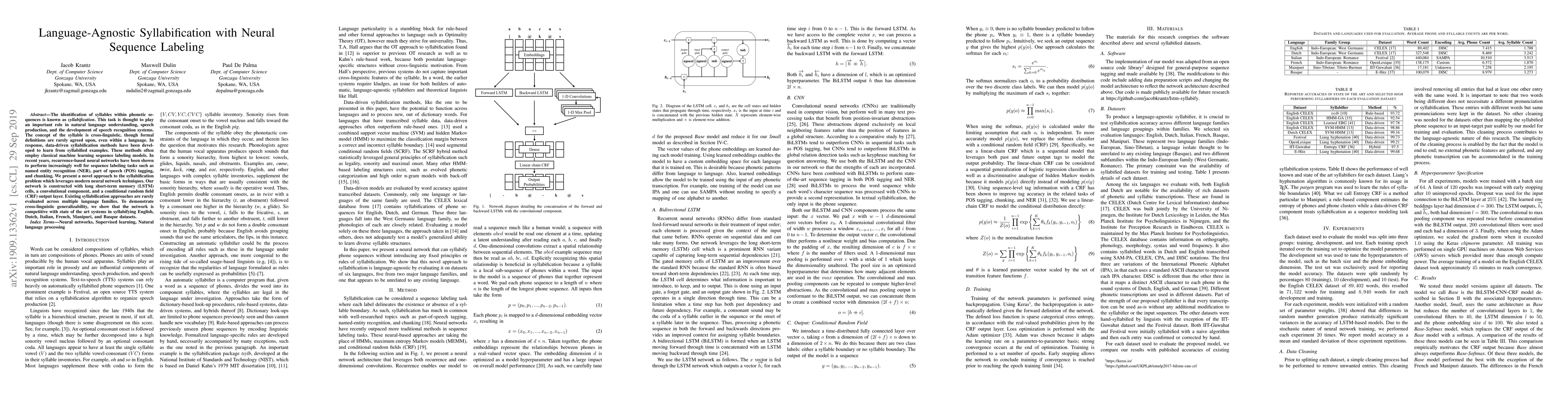 This paper introduces a neural network approach using LSTM, convolutional layers, and a CRF for language-agnostic syllabification, demonstrating competitive performance across multiple languages, including English, Dutch, Italian, French, Manipuri, and Basque.