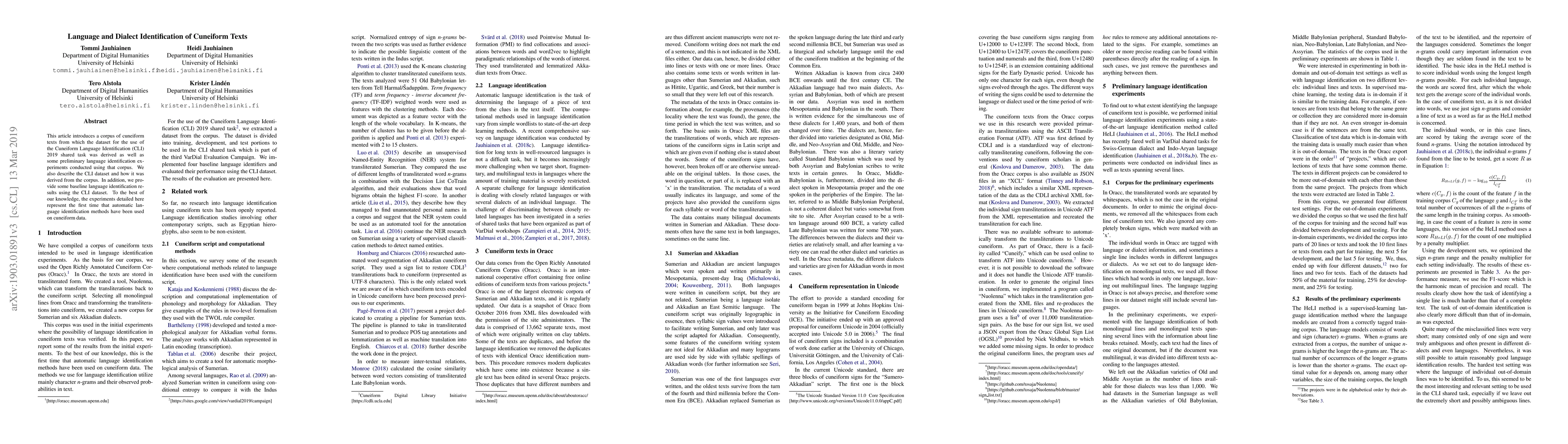 This research introduces a corpus of cuneiform texts and describes the Cuneiform Language Identification (CLI) dataset derived from it, using state-of-the-art language identification method HeLI for preliminary experiments.