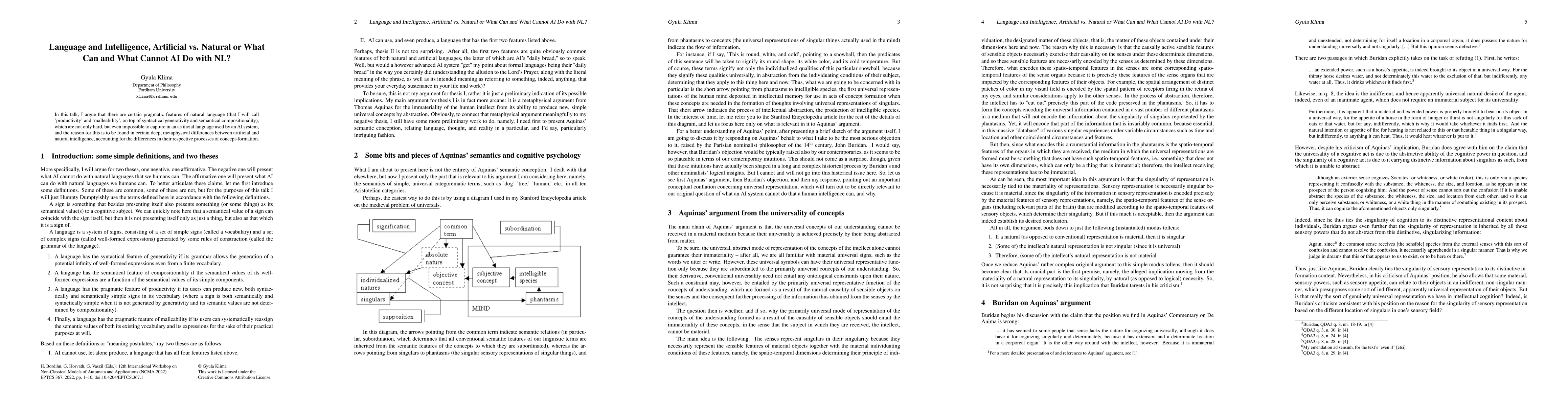 Summary: This paper argues that AI struggles to replicate natural language's pragmatic features like productivity and malleability due to deep metaphysical differences between artificial and natural intelligence, affecting AI's concept-formation processes. These differences make certain linguistic aspects inherently unattainable for AI.