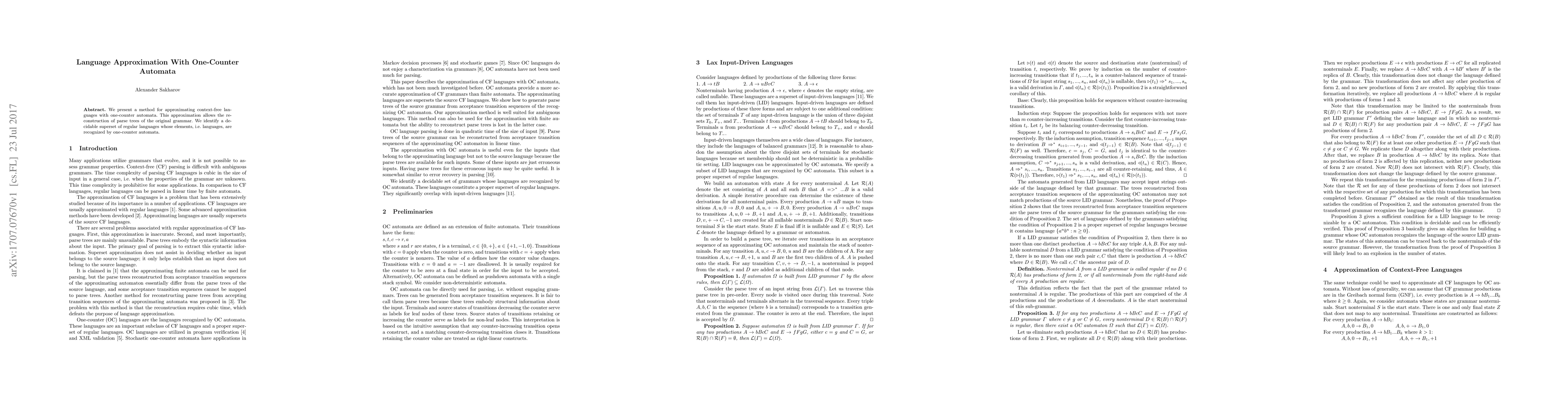 Two-line summary: This paper introduces a method to approximate context-free languages using one-counter automata, enabling the reconstruction of parse trees from the original grammar. It also identifies a decidable superset of regular languages recognized by these automata.