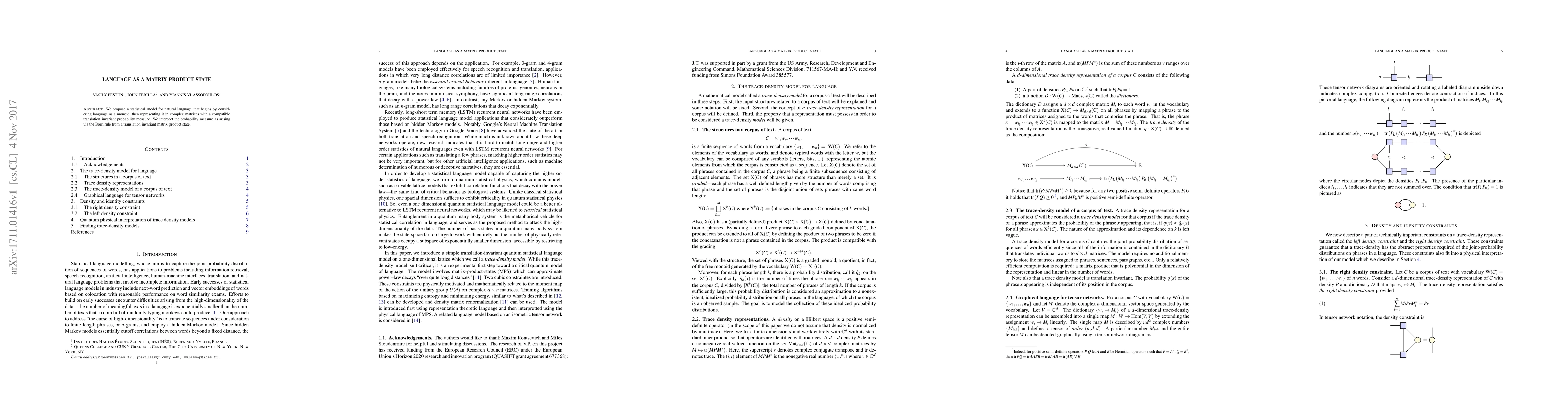 Researchers propose a statistical model for natural language that views it as a monoid represented in complex matrices with a translation invariant probability measure, inspired by quantum mechanics.