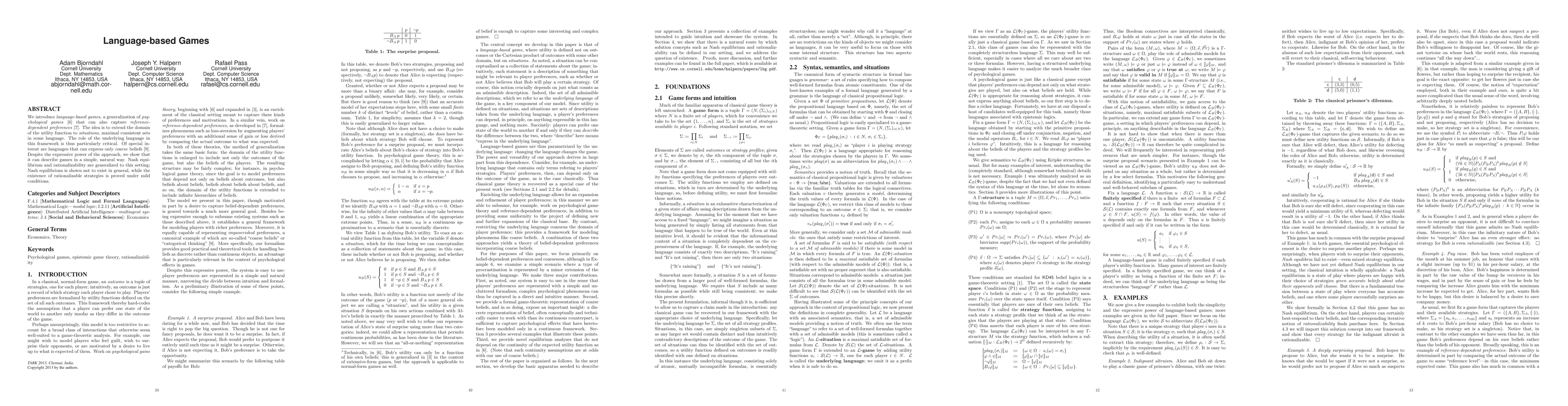 We introduce language-based games, a generalization of psychological games [6] that can also capture reference-dependent preferences [7]. The idea is to extend the domain of the utility function to situations, maximal consistent sets in some language. The role of the underlying language in this framework is thus particularly critical. Of special interest are languages that can express only coarse beliefs [9]. Despite the expressive power of the approach, we show that it can describe games in a simple, natural way. Nash equilibrium and rationalizability are generalized to this setting; Nash equilibrium is shown not to exist in general, while the existence of rationalizable strategies is proved under mild conditions.