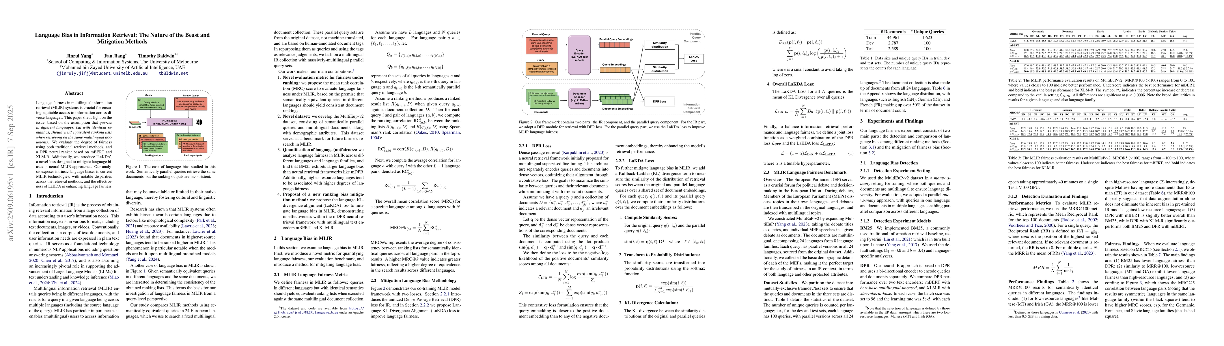 Language fairness in multilingual information retrieval (MLIR) systems is crucial for ensuring equitable access to information across diverse languages. This paper sheds light on the issue, based on the assumption that queries in different languages, but with identical semantics, should yield equivalent ranking lists when retrieving on the same multilingual documents. We evaluate the degree of fairness using both traditional retrieval methods, and a DPR neural ranker based on mBERT and XLM-R. Additionally, we introduce `LaKDA', a novel loss designed to mitigate language biases in neural MLIR approaches. Our analysis exposes intrinsic language biases in current MLIR technologies, with notable disparities across the retrieval methods, and the effectiveness of LaKDA in enhancing language fairness.