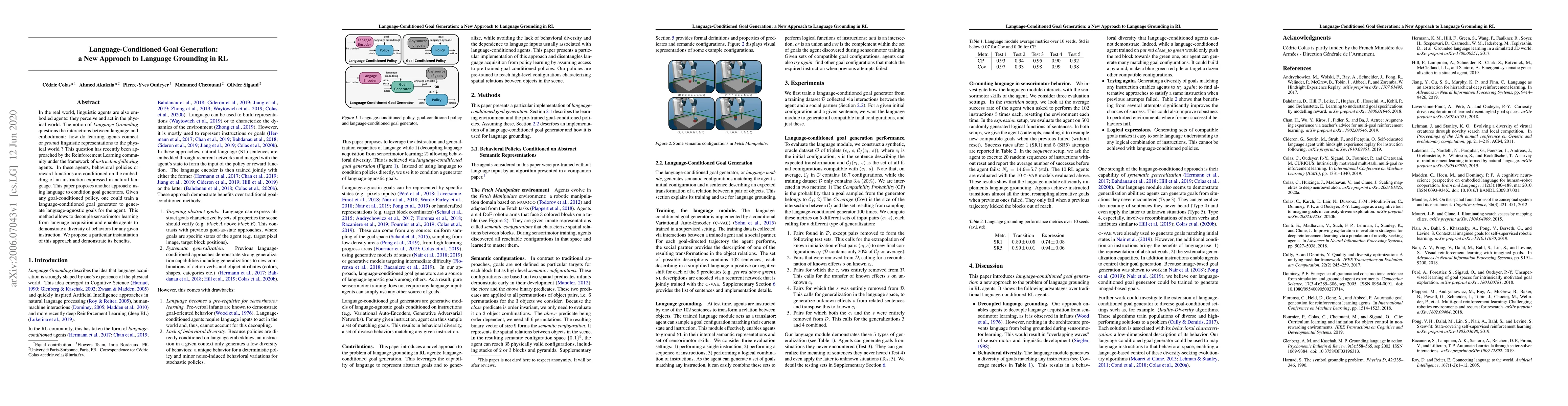 This paper introduces a novel method for grounding language in reinforcement learning by conditioning goal generators on language. It aims to decouple sensorimotor learning from language acquisition, enabling agents to exhibit diverse behaviors based on natural language instructions.
