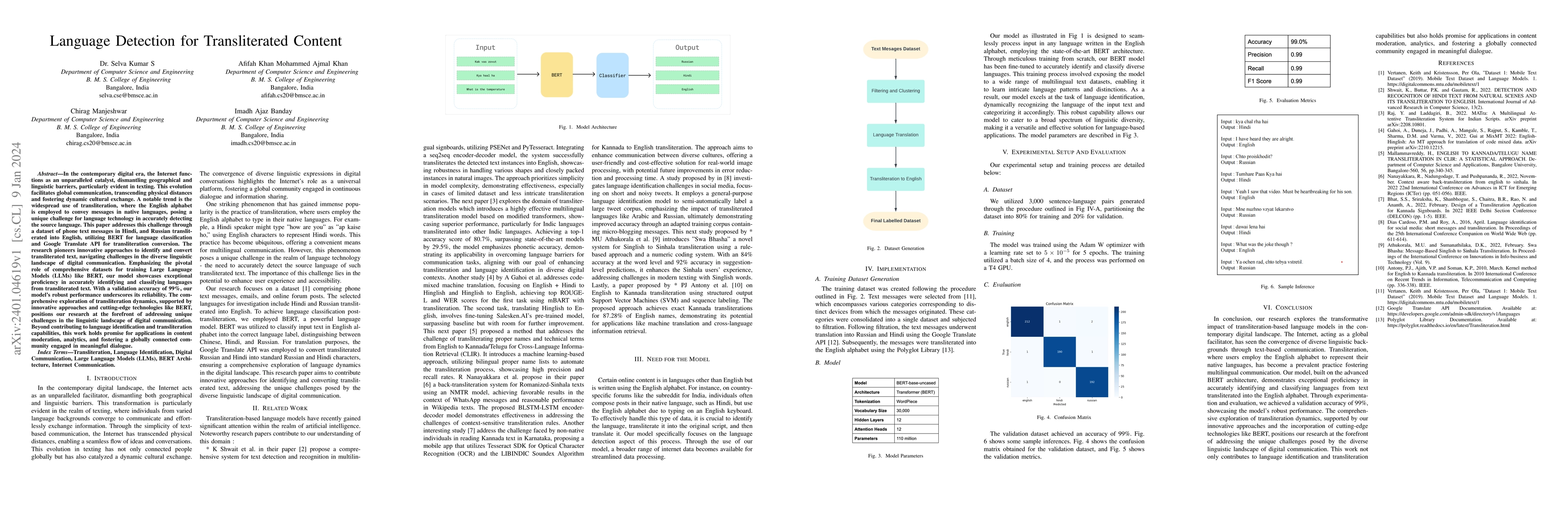 This paper develops a method for detecting and classifying languages in transliterated text using BERT and Google Translate, achieving 99% accuracy. The research highlights the importance of comprehensive datasets for training models, positioning it as a significant advancement in addressing linguistic challenges in digital communication.
