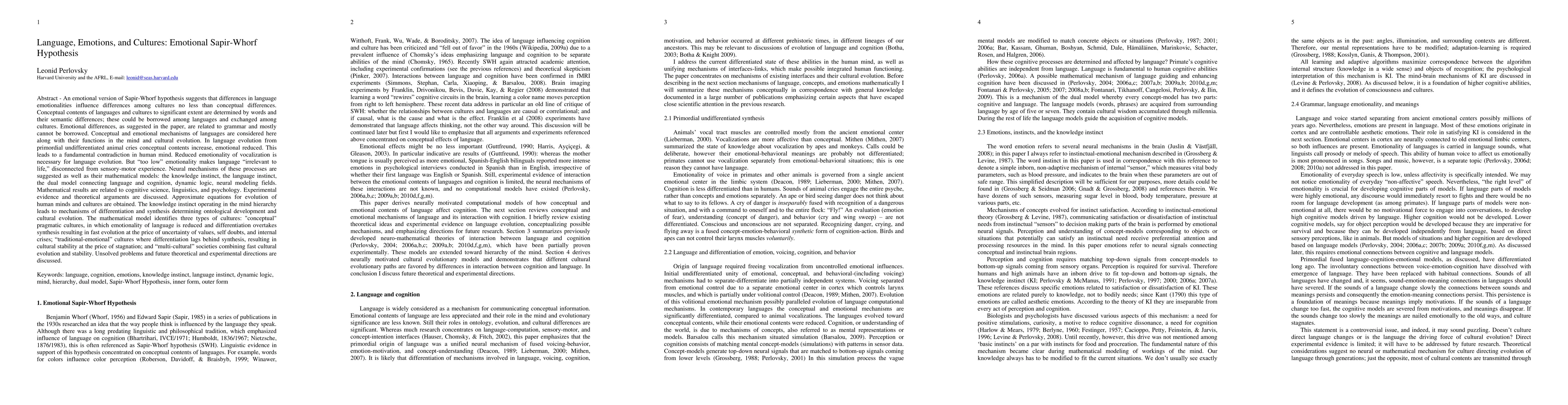 An emotional version of Sapir-Whorf hypothesis suggests that differences in language emotionalities influence differences among cultures no less than conceptual differences. Conceptual contents of languages and cultures to significant extent are determined by words and their semantic differences; these could be borrowed among languages and exchanged among cultures. Emotional differences, as suggested in the paper, are related to grammar and mostly cannot be borrowed. Conceptual and emotional mechanisms of languages are considered here along with their functions in the mind and cultural evolution. A fundamental contradiction in human mind is considered: language evolution requires reduced emotionality, but "too low" emotionality makes language "irrelevant to life," disconnected from sensory-motor experience. Neural mechanisms of these processes are suggested as well as their mathematical models: the knowledge instinct, the language instinct, the dual model connecting language and cognition, dynamic logic, neural modeling fields. Mathematical results are related to cognitive science, linguistics, and psychology. Experimental evidence and theoretical arguments are discussed. Approximate equations for evolution of human minds and cultures are obtained. Their solutions identify three types of cultures: "conceptual"-pragmatic cultures, in which emotionality of language is reduced and differentiation overtakes synthesis resulting in fast evolution at the price of uncertainty of values, self doubts, and internal crises; "traditional-emotional" cultures where differentiation lags behind synthesis, resulting in cultural stability at the price of stagnation; and "multi-cultural" societies combining fast cultural evolution and stability. Unsolved problems and future theoretical and experimental directions are discussed.