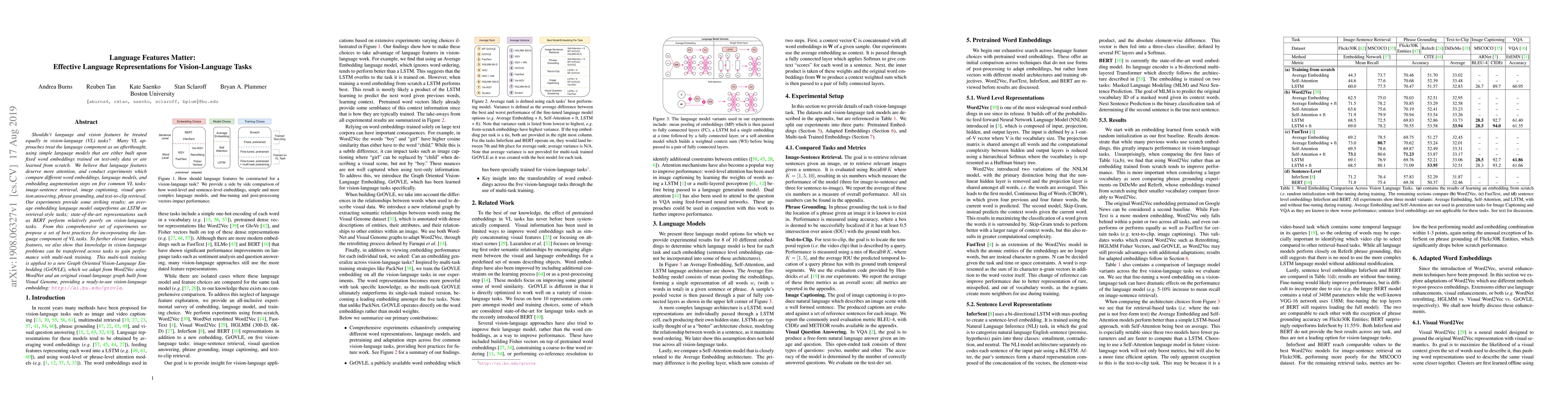 Shouldn't language and vision features be treated equally in vision-language (VL) tasks? Many VL approaches treat the language component as an afterthought, using simple language models that are either built upon fixed word embeddings trained on text-only data or are learned from scratch. We believe that language features deserve more attention, and conduct experiments which compare different word embeddings, language models, and embedding augmentation steps on five common VL tasks: image-sentence retrieval, image captioning, visual question answering, phrase grounding, and text-to-clip retrieval. Our experiments provide some striking results; an average embedding language model outperforms an LSTM on retrieval-style tasks; state-of-the-art representations such as BERT perform relatively poorly on vision-language tasks. From this comprehensive set of experiments we propose a set of best practices for incorporating the language component of VL tasks. To further elevate language features, we also show that knowledge in vision-language problems can be transferred across tasks to gain performance with multi-task training. This multi-task training is applied to a new Graph Oriented Vision-Language Embedding (GrOVLE), which we adapt from Word2Vec using WordNet and an original visual-language graph built from Visual Genome, providing a ready-to-use vision-language embedding: http://ai.bu.edu/grovle.