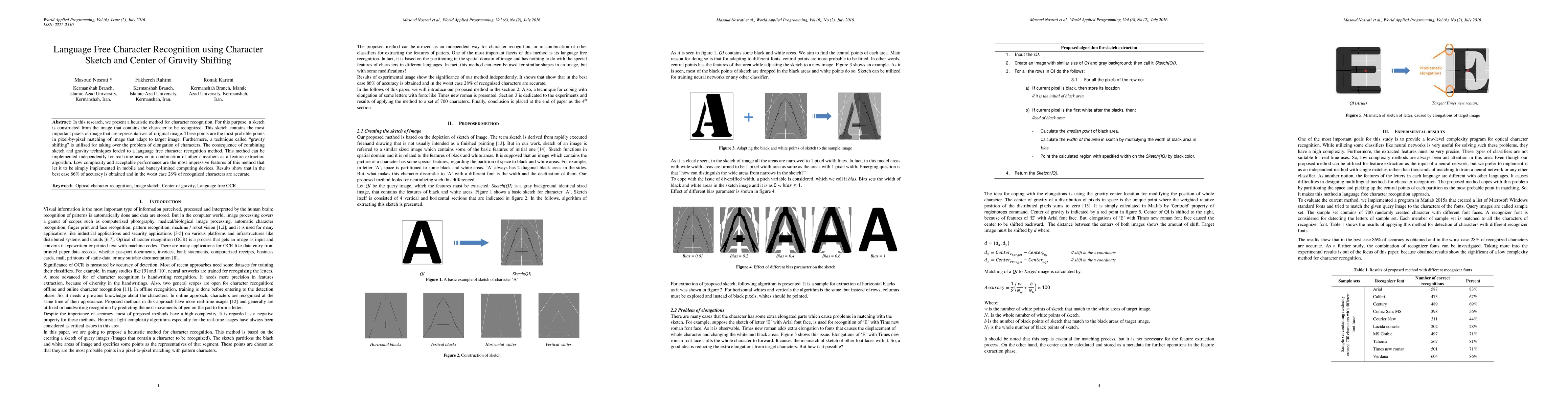 In this research, we present a heuristic method for character recognition. For this purpose, a sketch is constructed from the image that contains the character to be recognized. This sketch contains the most important pixels of image that are representatives of original image. These points are the most probable points in pixel-by-pixel matching of image that adapt to target image. Furthermore, a technique called gravity shifting is utilized for taking over the problem of elongation of characters. The consequence of combining sketch and gravity techniques leaded to a language free character recognition method. This method can be implemented independently for real-time uses or in combination of other classifiers as a feature extraction algorithm. Low complexity and acceptable performance are the most impressive features of this method that let it to be simply implemented in mobile and battery-limited computing devices. Results show that in the best case 86% of accuracy is obtained and in the worst case 28% of recognized characters are accurate.