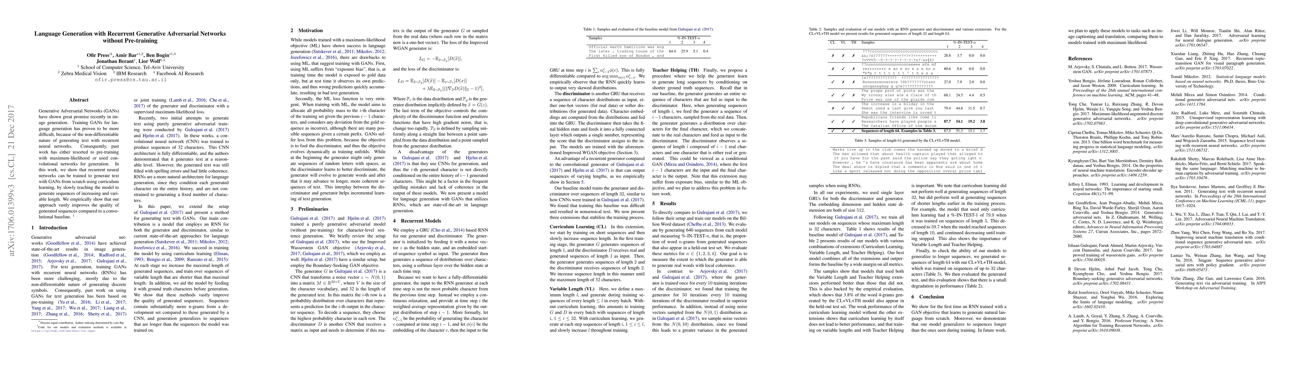 This paper demonstrates that recurrent neural networks can generate text using Generative Adversarial Networks (GANs) without pre-training, employing curriculum learning to progressively teach the model to handle sequences of increasing length. The approach significantly improves text generation quality compared to convolutional baselines.