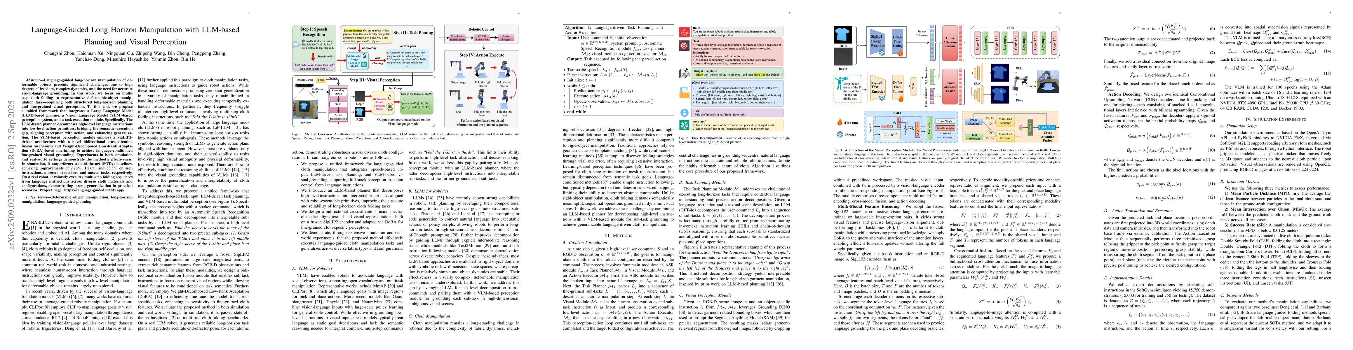 Language-guided long-horizon manipulation of deformable objects presents significant challenges due to high degrees of freedom, complex dynamics, and the need for accurate vision-language grounding. In this work, we focus on multi-step cloth folding, a representative deformable-object manipulation task that requires both structured long-horizon planning and fine-grained visual perception. To this end, we propose a unified framework that integrates a Large Language Model (LLM)-based planner, a Vision-Language Model (VLM)-based perception system, and a task execution module. Specifically, the LLM-based planner decomposes high-level language instructions into low-level action primitives, bridging the semantic-execution gap, aligning perception with action, and enhancing generalization. The VLM-based perception module employs a SigLIP2-driven architecture with a bidirectional cross-attention fusion mechanism and weight-decomposed low-rank adaptation (DoRA) fine-tuning to achieve language-conditioned fine-grained visual grounding. Experiments in both simulation and real-world settings demonstrate the method's effectiveness. In simulation, it outperforms state-of-the-art baselines by 2.23, 1.87, and 33.3 on seen instructions, unseen instructions, and unseen tasks, respectively. On a real robot, it robustly executes multi-step folding sequences from language instructions across diverse cloth materials and configurations, demonstrating strong generalization in practical scenarios. Project page: https://language-guided.netlify.app/
