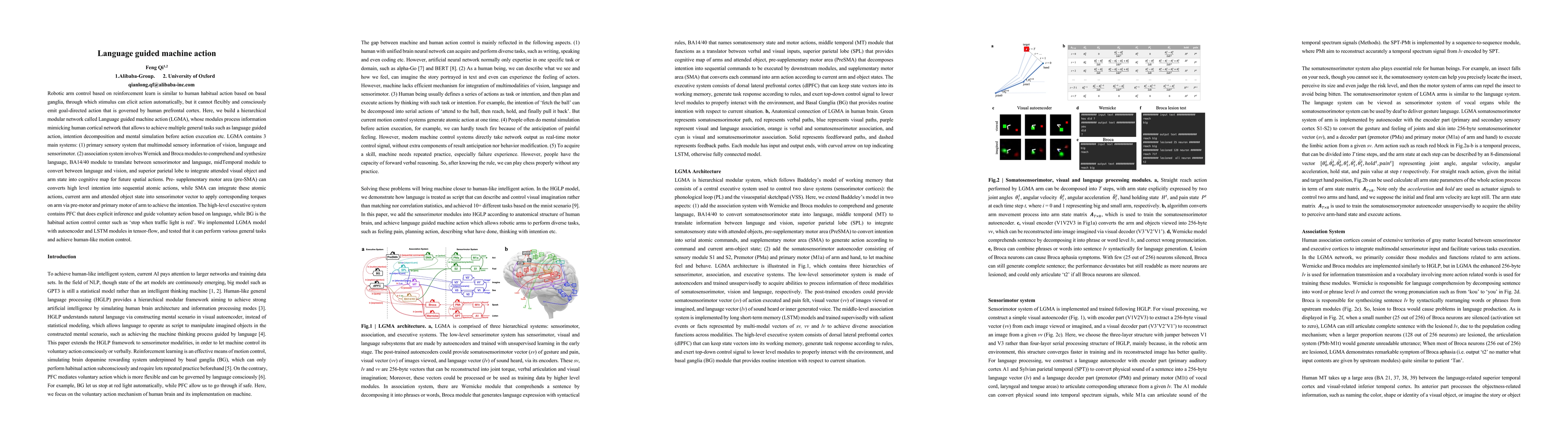 Here we build a hierarchical modular network called Language guided machine action (LGMA), whose modules process information stream mimicking human cortical network that allows to achieve multiple general tasks such as language guided action, intention decomposition and mental simulation before action execution etc. LGMA contains 3 main systems: (1) primary sensory system that multimodal sensory information of vision, language and sensorimotor. (2) association system involves and Broca modules to comprehend and synthesize language, BA14/40 module to translate between sensorimotor and language, midTemporal module to convert between language and vision, and superior parietal lobe to integrate attended visual object and arm state into cognitive map for future spatial actions. Pre-supplementary motor area (pre-SMA) can converts high level intention into sequential atomic actions, while SMA can integrate these atomic actions, current arm and attended object state into sensorimotor vector to apply corresponding torques on arm via pre-motor and primary motor of arm to achieve the intention. The high-level executive system contains PFC that does explicit inference and guide voluntary action based on language, while BG is the habitual action control center.
