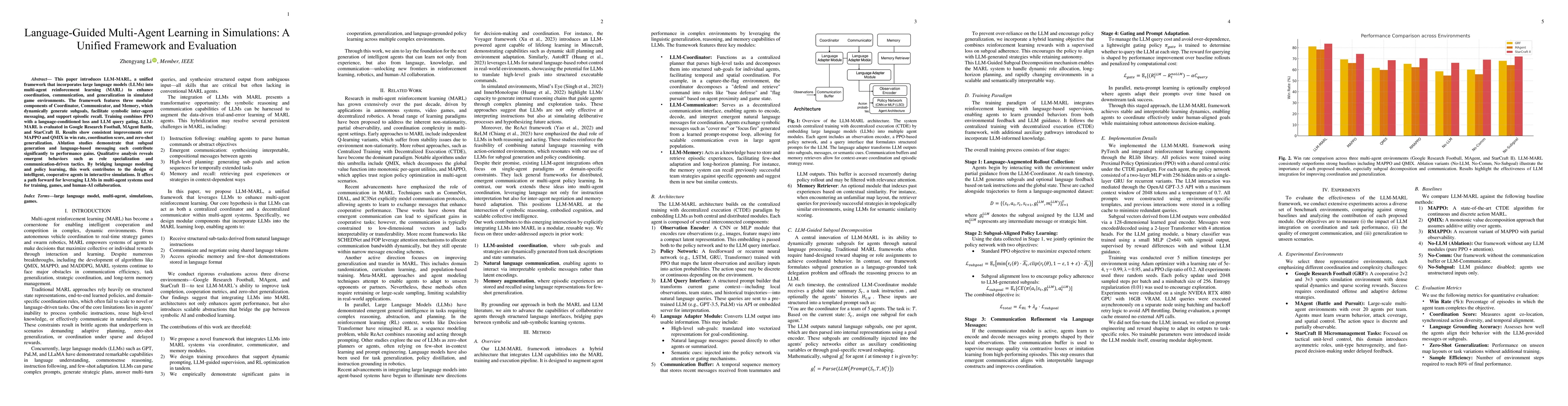 The paper introduces LLM-MARL, a unified framework that integrates large language models (LLMs) into multi-agent reinforcement learning (MARL) by incorporating three modular components: Coordinator, Communicator, and Memory. These components facilitate subgoal generation, symbolic inter-agent messaging, and episodic recall, respectively. The training combines PPO with a language-conditioned loss and LLM query gating.
