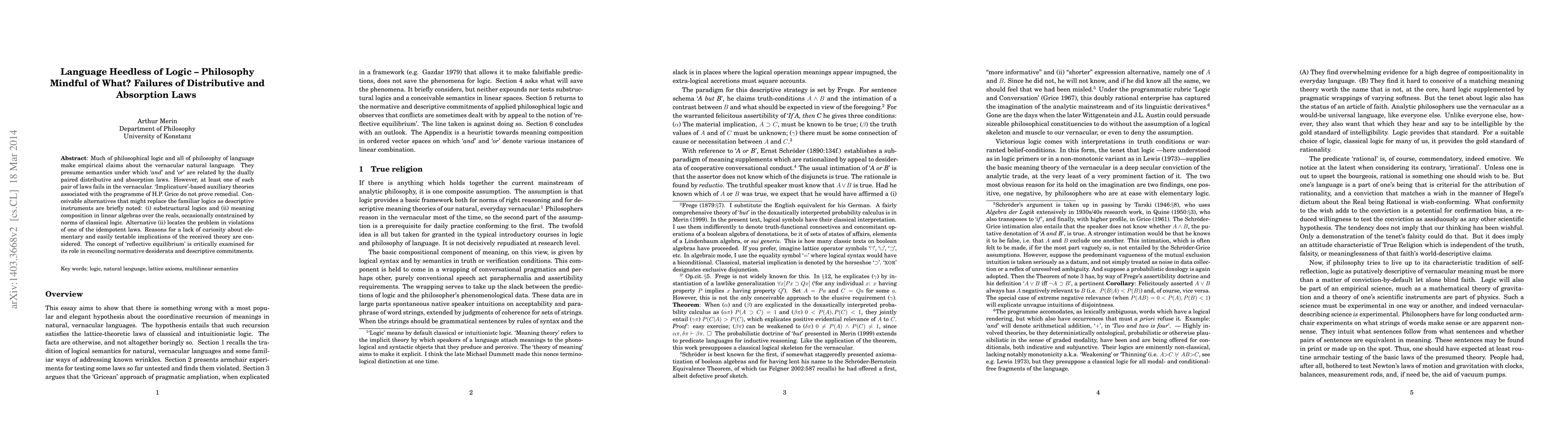Much of philosophical logic and all of philosophy of language make empirical claims about the vernacular natural language. They presume semantics under which `and' and `or' are related by the dually paired distributive and absorption laws. However, at least one of each pair of laws fails in the vernacular. `Implicature'-based auxiliary theories associated with the programme of H.P. Grice do not prove remedial. Conceivable alternatives that might replace the familiar logics as descriptive instruments are briefly noted: (i) substructural logics and (ii) meaning composition in linear algebras over the reals, occasionally constrained by norms of classical logic. Alternative (ii) locates the problem in violations of one of the idempotent laws. Reasons for a lack of curiosity about elementary and easily testable implications of the received theory are considered. The concept of `reflective equilibrium' is critically examined for its role in reconciling normative desiderata and descriptive commitments.