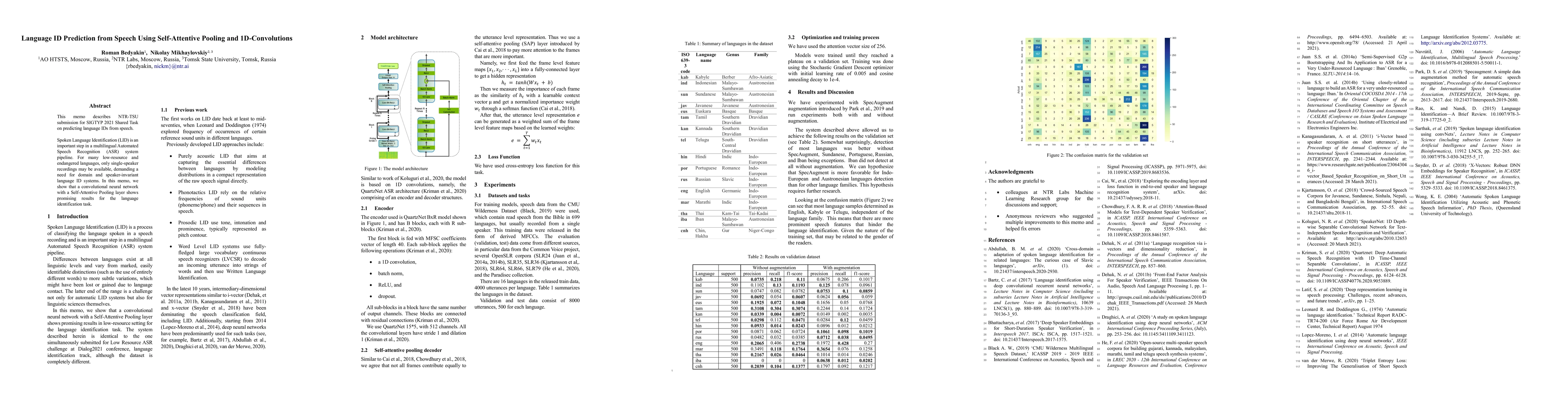 This memo describes NTR-TSU submission for SIGTYP 2021 Shared Task on predicting language IDs from speech. Spoken Language Identification (LID) is an important step in a multilingual Automated Speech Recognition (ASR) system pipeline. For many low-resource and endangered languages, only single-speaker recordings may be available, demanding a need for domain and speaker-invariant language ID systems. In this memo, we show that a convolutional neural network with a Self-Attentive Pooling layer shows promising results for the language identification task.