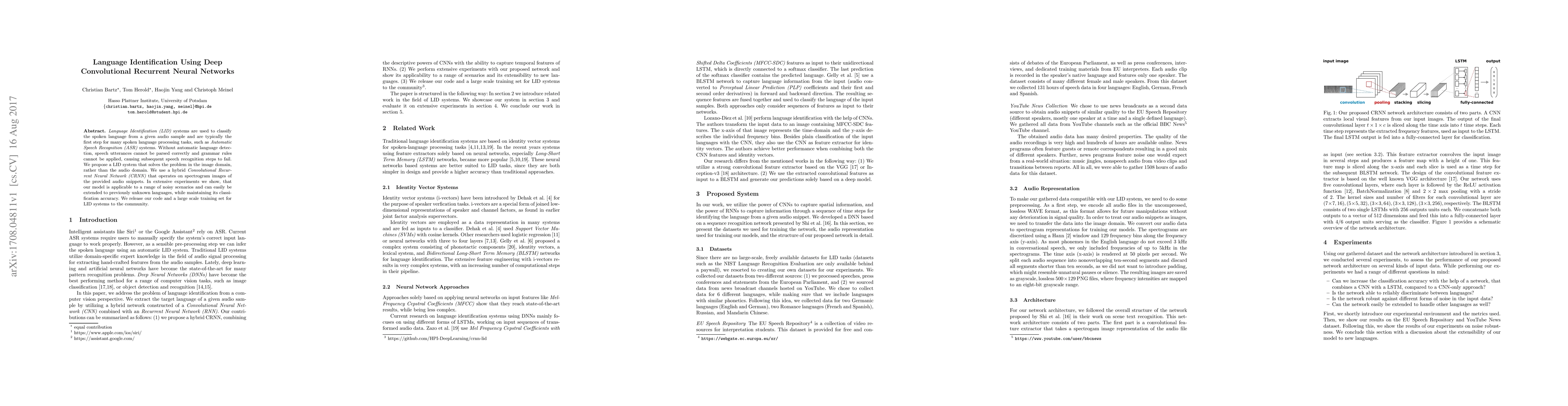 Language Identification (LID) systems are used to classify the spoken language from a given audio sample and are typically the first step for many spoken language processing tasks, such as Automatic Speech Recognition (ASR) systems. Without automatic language detection, speech utterances cannot be parsed correctly and grammar rules cannot be applied, causing subsequent speech recognition steps to fail. We propose a LID system that solves the problem in the image domain, rather than the audio domain. We use a hybrid Convolutional Recurrent Neural Network (CRNN) that operates on spectrogram images of the provided audio snippets. In extensive experiments we show, that our model is applicable to a range of noisy scenarios and can easily be extended to previously unknown languages, while maintaining its classification accuracy. We release our code and a large scale training set for LID systems to the community.