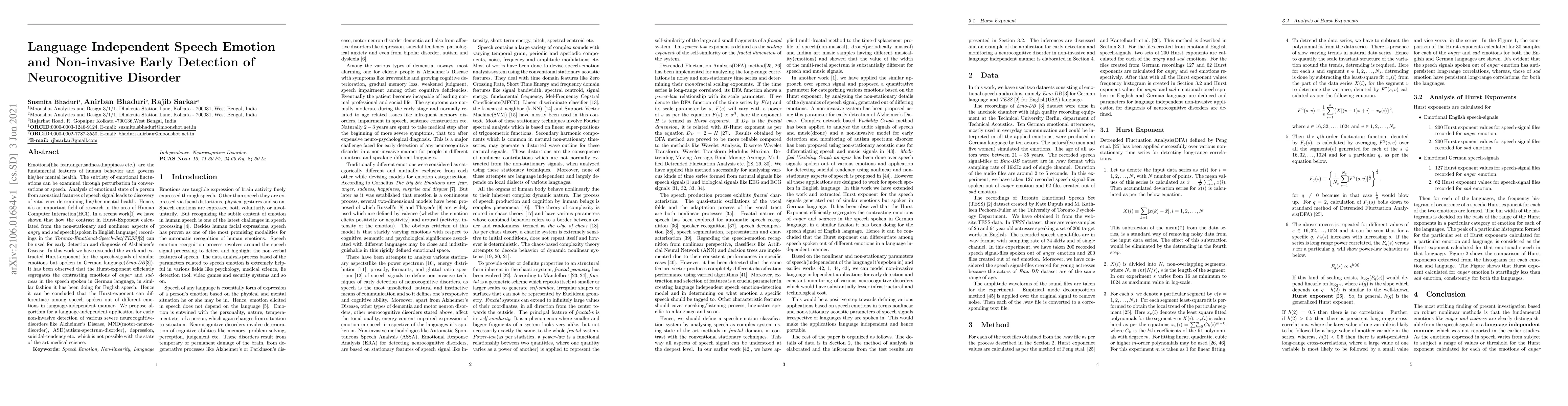 Emotions(like fear,anger,sadness,happiness etc.) are the fundamental features of human behavior and governs his/her mental health. The subtlety of emotional fluctuations can be examined through perturbation in conversations or speech. Analysis of emotional state of a person from acoustical features of speech signal leads to discovery of vital cues determining his or her mental health. Hence, it's an important field of research in the area of Human Computer Interaction(HCI). In a recent work we have shown that how the contrast in Hurst-Exponent calculated from the non-stationary and nonlinear aspects of "angry" and "sad" speech(spoken in English language) recordings in the Toronto-Emotional-Speech-Set(TESS) can be used for early detection and diagnosis of Alzheimer's Disease. In this work we have extended the work and extracted Hurst-exponent for the speech-signals of similar emotions but spoken in German language. It has been observed that the Hurst-exponent efficiently segregates the contrasting emotions of "anger" and "sadness" in the speech spoken in German language, in similar fashion it has been doing for English speech. Hence it can be concluded that the Hurst-exponent can differentiate among speech spoken out of different emotions in language-independent manner. We propose algorithm for a language-independent application for early non-invasive detection of various severe neurocognitive-disorders like Alzheimer's Disease, MND(motor-neuron-disorder), ASD(autism-spectrum-disorder), depression, suicidal-tendency etc. which is not possible with the state of the art medical science.