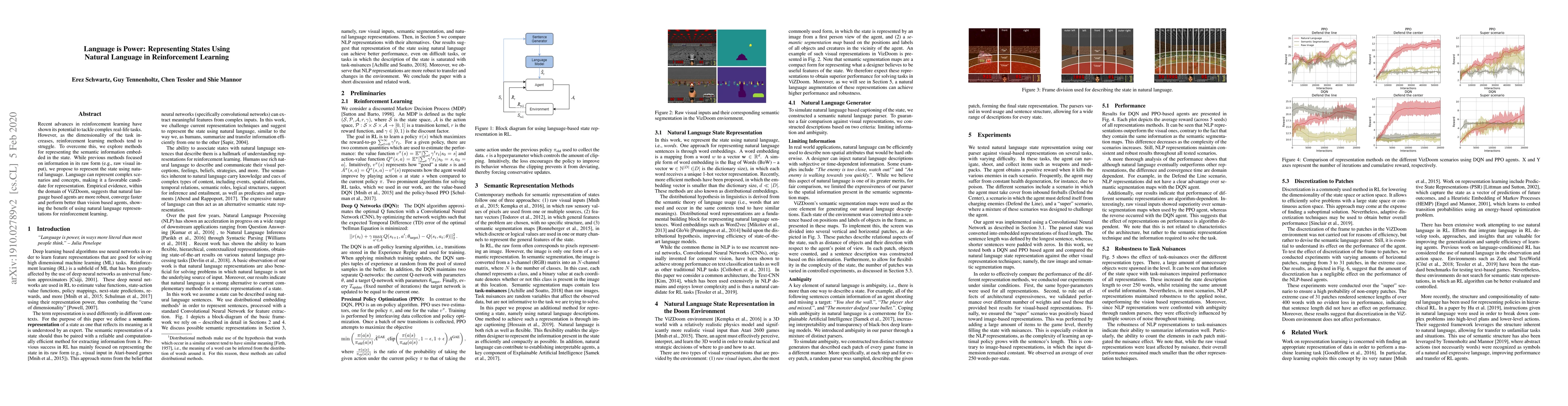 Recent advances in reinforcement learning have shown its potential to tackle complex real-life tasks. However, as the dimensionality of the task increases, reinforcement learning methods tend to struggle. To overcome this, we explore methods for representing the semantic information embedded in the state. While previous methods focused on information in its raw form (e.g., raw visual input), we propose to represent the state using natural language. Language can represent complex scenarios and concepts, making it a favorable candidate for representation. Empirical evidence, within the domain of ViZDoom, suggests that natural language based agents are more robust, converge faster and perform better than vision based agents, showing the benefit of using natural language representations for reinforcement learning.