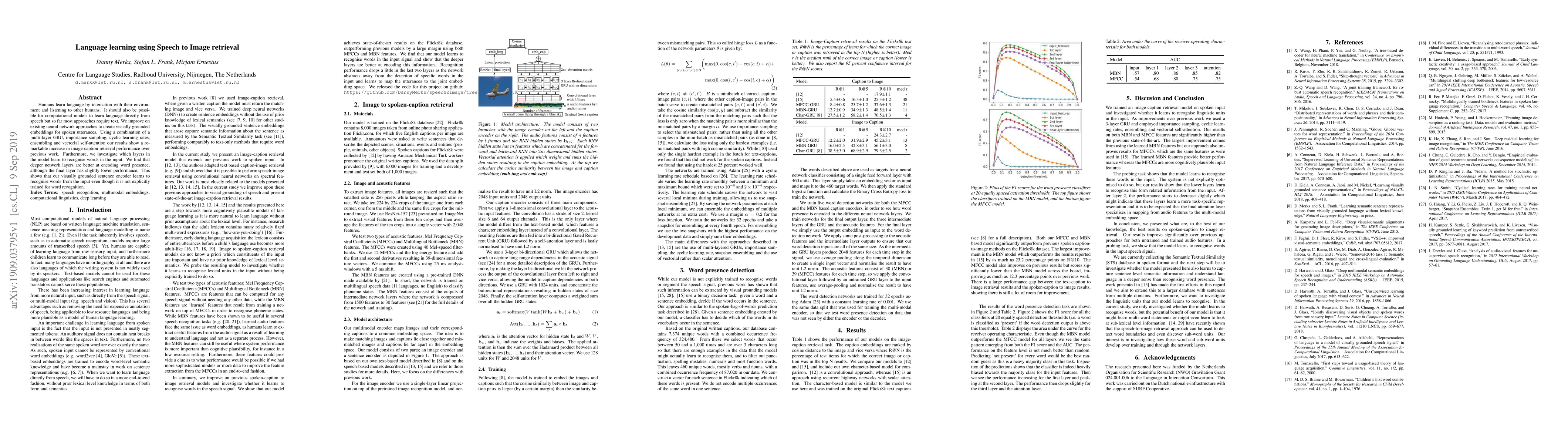 This paper presents a neural network model that improves language learning through speech-to-image retrieval without requiring text. The approach, combining various techniques, significantly enhances image-caption retrieval performance, demonstrating that deeper network layers effectively encode word presence even without explicit word recognition training.