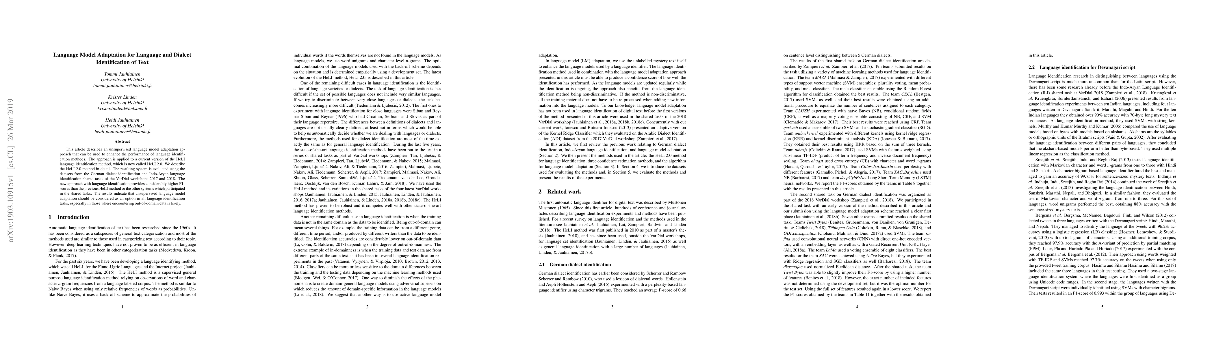 This article describes an unsupervised language model adaptation approach that can be used to enhance the performance of language identification methods. The approach is applied to a current version of the HeLI language identification method, which is now called HeLI 2.0. We describe the HeLI 2.0 method in detail. The resulting system is evaluated using the datasets from the German dialect identification and Indo-Aryan language identification shared tasks of the VarDial workshops 2017 and 2018. The new approach with language identification provides considerably higher F1-scores than the previous HeLI method or the other systems which participated in the shared tasks. The results indicate that unsupervised language model adaptation should be considered as an option in all language identification tasks, especially in those where encountering out-of-domain data is likely.