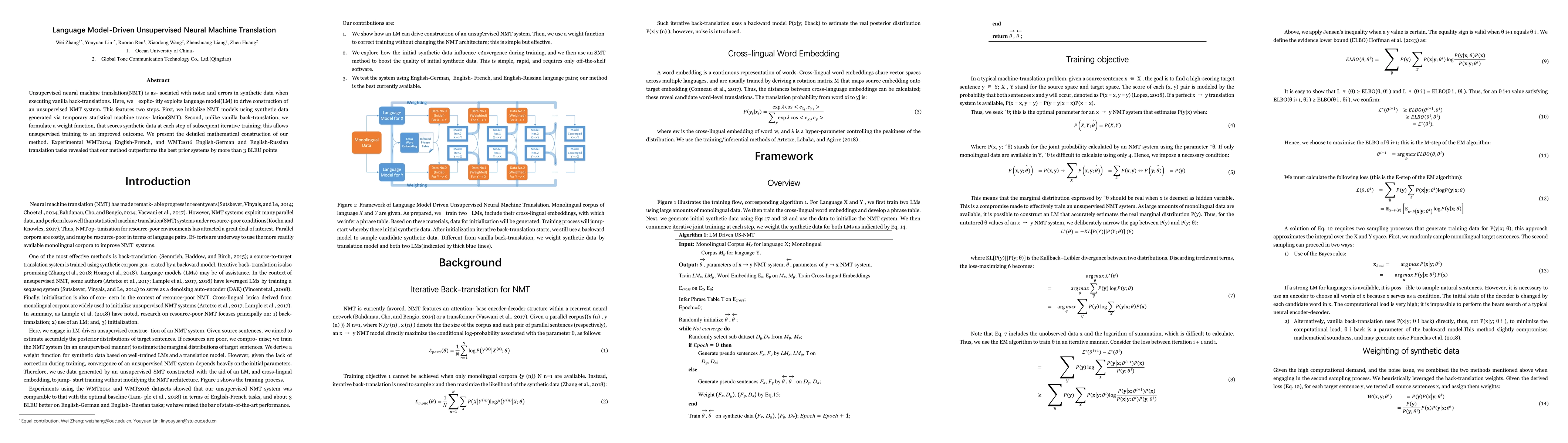 This paper proposes an unsupervised neural machine translation system driven by a language model to improve synthetic data quality, achieving better translation results than prior systems. The method initializes models using temporary SMT data and iteratively trains with a weight function to score synthetic data, outperforming previous methods by over 3 BLEU points on multiple tasks.