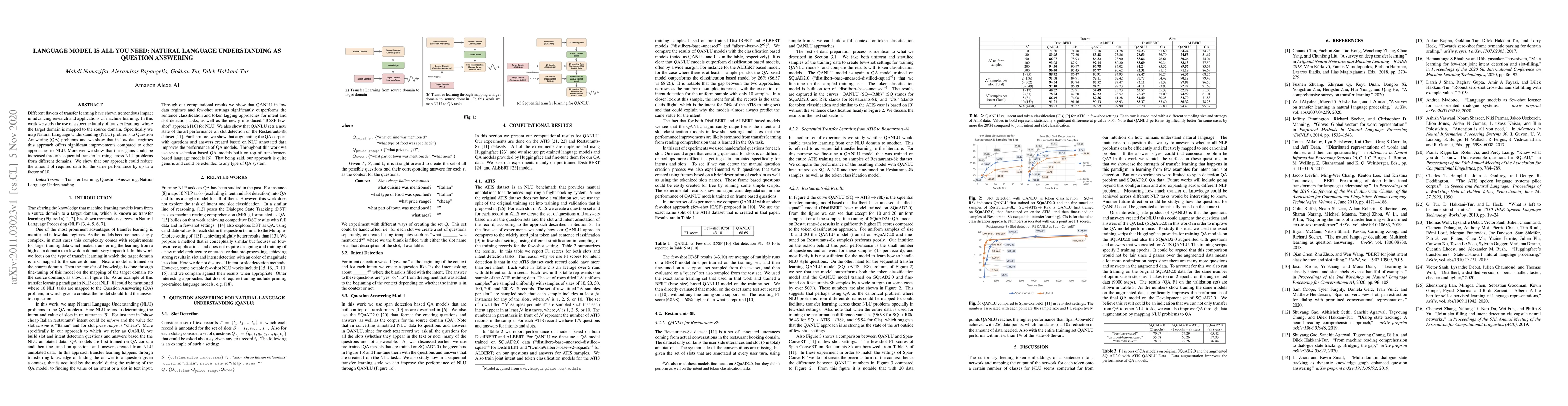 Different flavors of transfer learning have shown tremendous impact in advancing research and applications of machine learning. In this work we study the use of a specific family of transfer learning, where the target domain is mapped to the source domain. Specifically we map Natural Language Understanding (NLU) problems to QuestionAnswering (QA) problems and we show that in low data regimes this approach offers significant improvements compared to other approaches to NLU. Moreover we show that these gains could be increased through sequential transfer learning across NLU problems from different domains. We show that our approach could reduce the amount of required data for the same performance by up to a factor of 10.