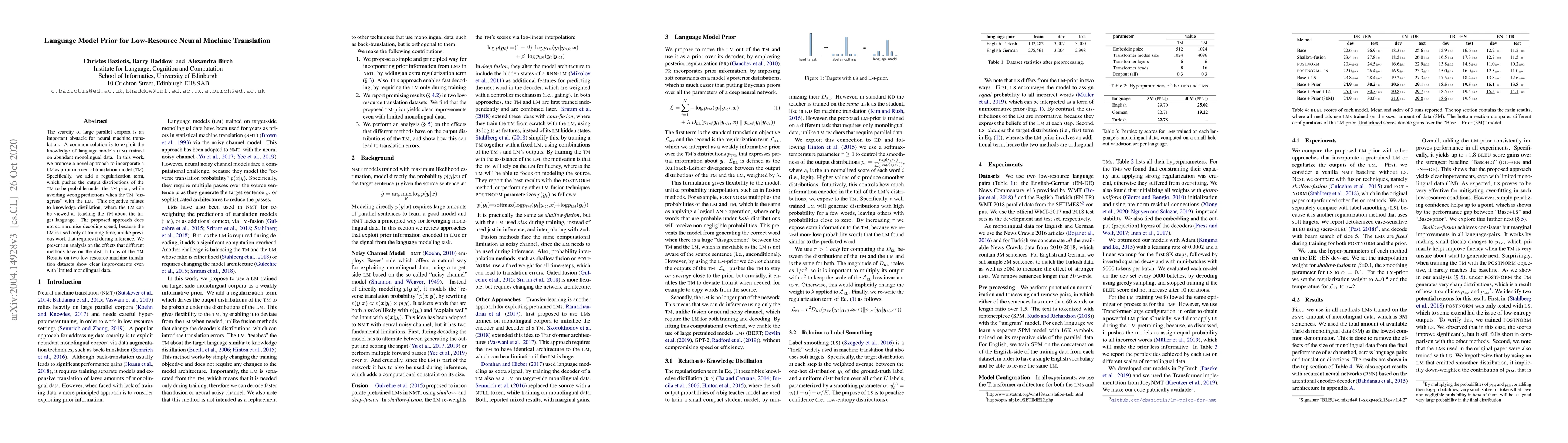 This paper proposes a method to enhance low-resource neural machine translation by incorporating a language model (LM) as a prior in the translation model (TM). The approach adds a regularization term that aligns the TM's output distributions with the LM's probability while allowing for correct predictions when they differ. This results in better translation performance with limited parallel data without impacting decoding speed.