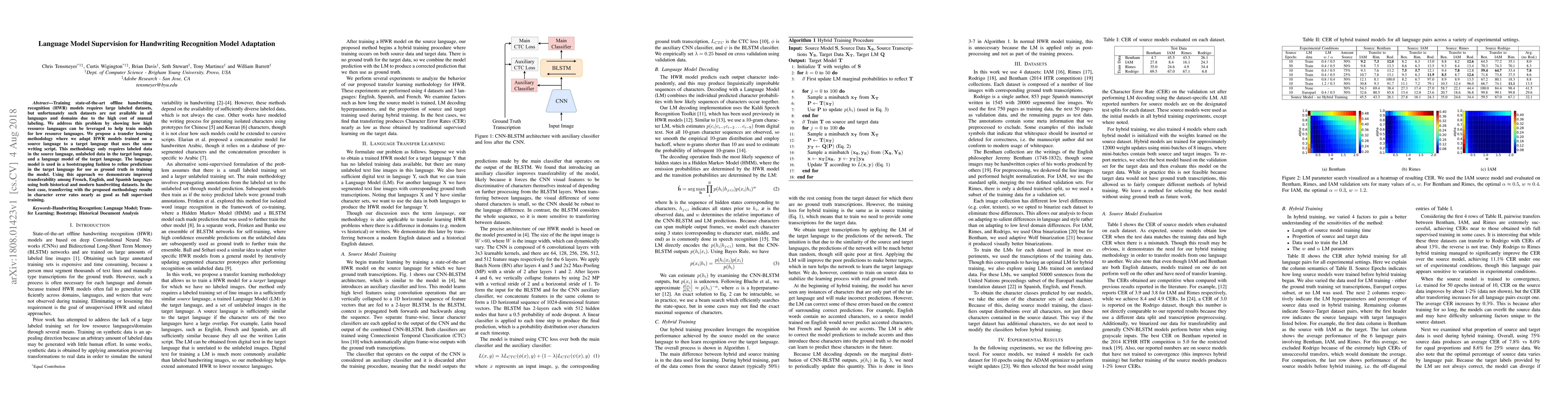 This paper proposes a transfer learning methodology to adapt handwriting recognition models for low-resource languages using high-resource language supervision. The approach leverages labeled data from a source language, unlabeled data from the target language, and a language model to refine predictions, achieving near full-supervised training performance.