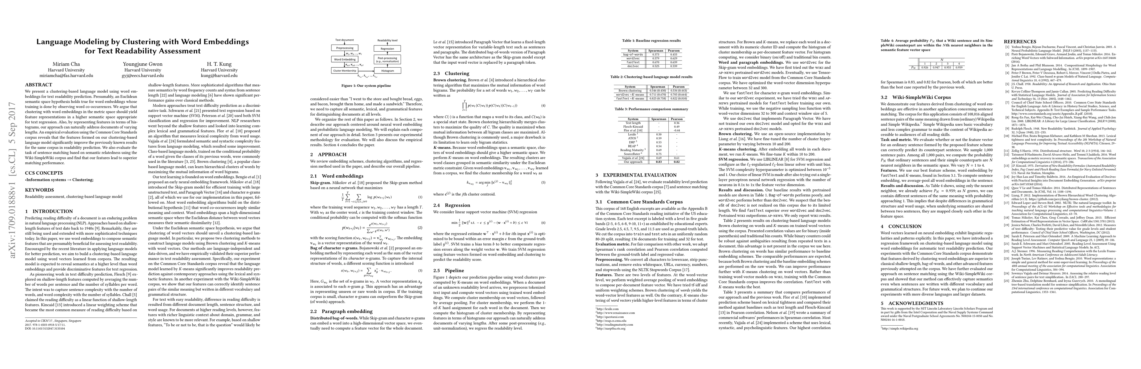 This paper proposes a clustering-based language model using word embeddings to enhance text readability prediction. The model leverages word embeddings in a higher semantic space to improve readability assessment and sentence matching performance, outperforming previous methods on the Common Core Standards corpus and the Wiki-SimpleWiki corpus.