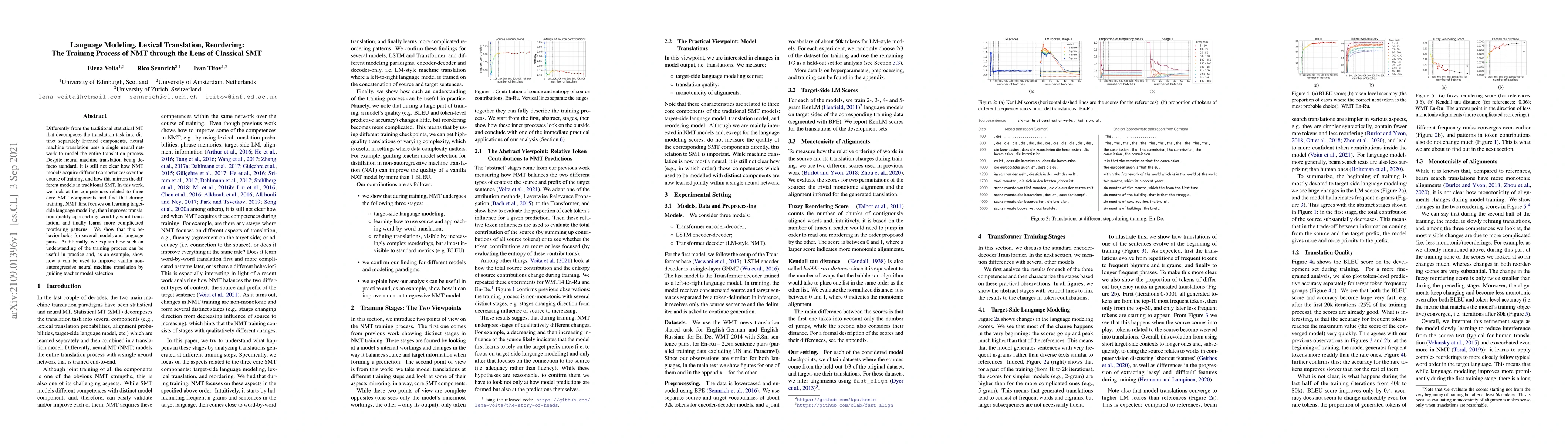 Differently from the traditional statistical MT that decomposes the translation task into distinct separately learned components, neural machine translation uses a single neural network to model the entire translation process. Despite neural machine translation being de-facto standard, it is still not clear how NMT models acquire different competences over the course of training, and how this mirrors the different models in traditional SMT. In this work, we look at the competences related to three core SMT components and find that during training, NMT first focuses on learning target-side language modeling, then improves translation quality approaching word-by-word translation, and finally learns more complicated reordering patterns. We show that this behavior holds for several models and language pairs. Additionally, we explain how such an understanding of the training process can be useful in practice and, as an example, show how it can be used to improve vanilla non-autoregressive neural machine translation by guiding teacher model selection.