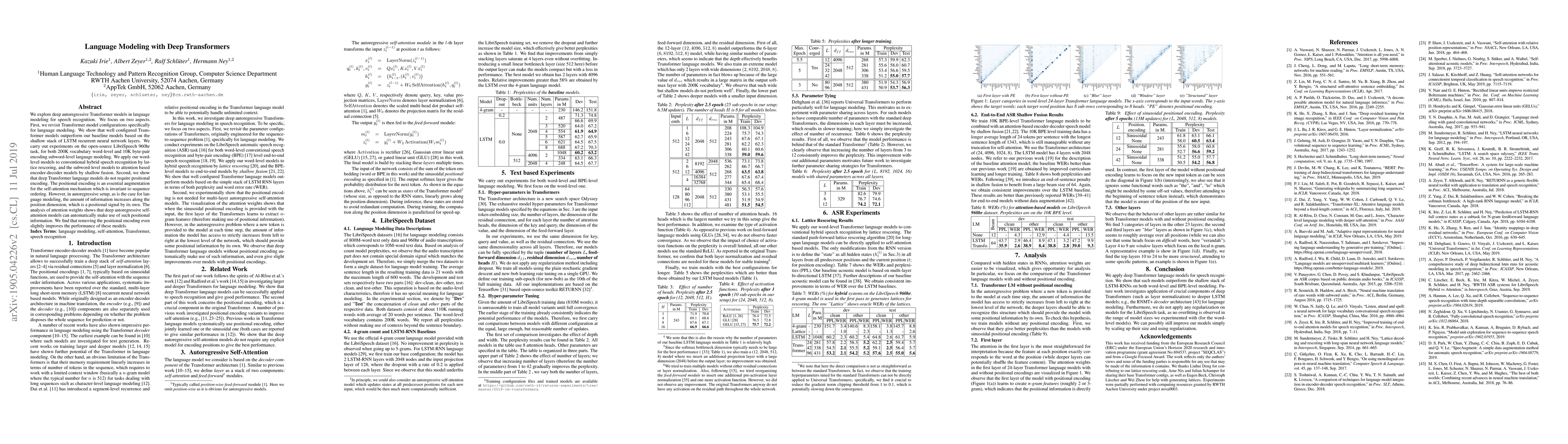 This paper investigates deep Transformer models for language modeling in speech recognition, demonstrating that well-configured Transformers outperform LSTM baselines. It also finds that deep autoregressive Transformers do not need positional encodings, as they can inherently utilize positional information.