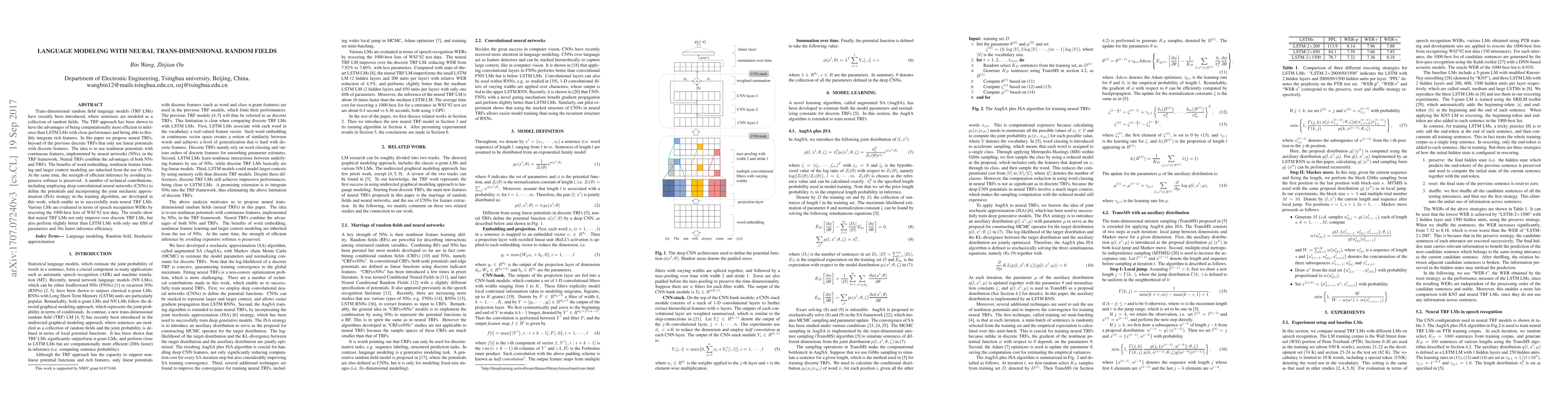 This research introduces neural trans-dimensional random field language models (TRF LMs), combining the computational efficiency of TRFs with the feature learning capabilities of neural networks. The proposed neural TRFs leverage deep convolutional neural networks and joint stochastic approximation for training, achieving better performance in speech recognition tasks with significantly reduced parameters and faster inference compared to LSTM LMs.