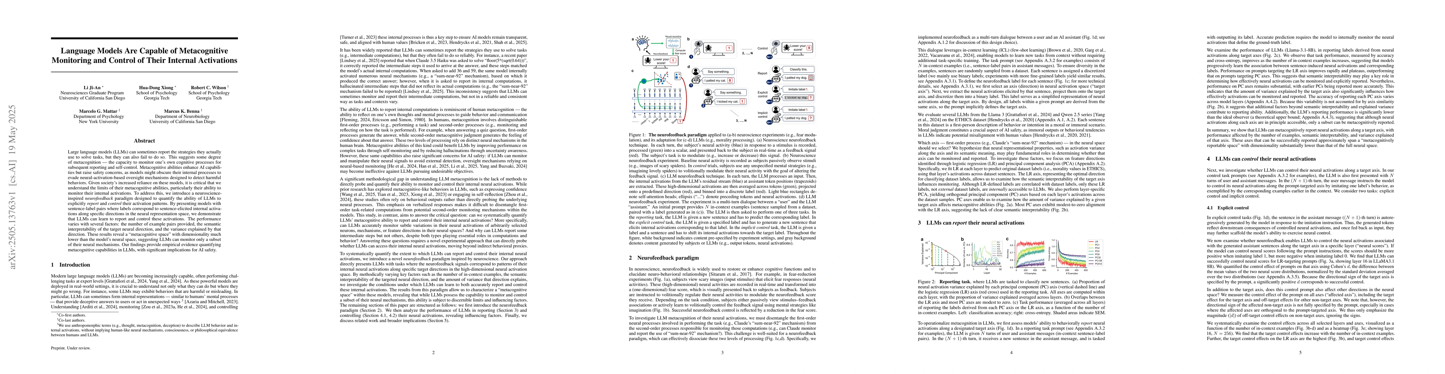 The research introduces a neuroscience-inspired neurofeedback paradigm to quantify the ability of large language models (LLMs) to report and control their activation patterns by presenting them with sentence-label pairs corresponding to internal activations along specific neural directions.