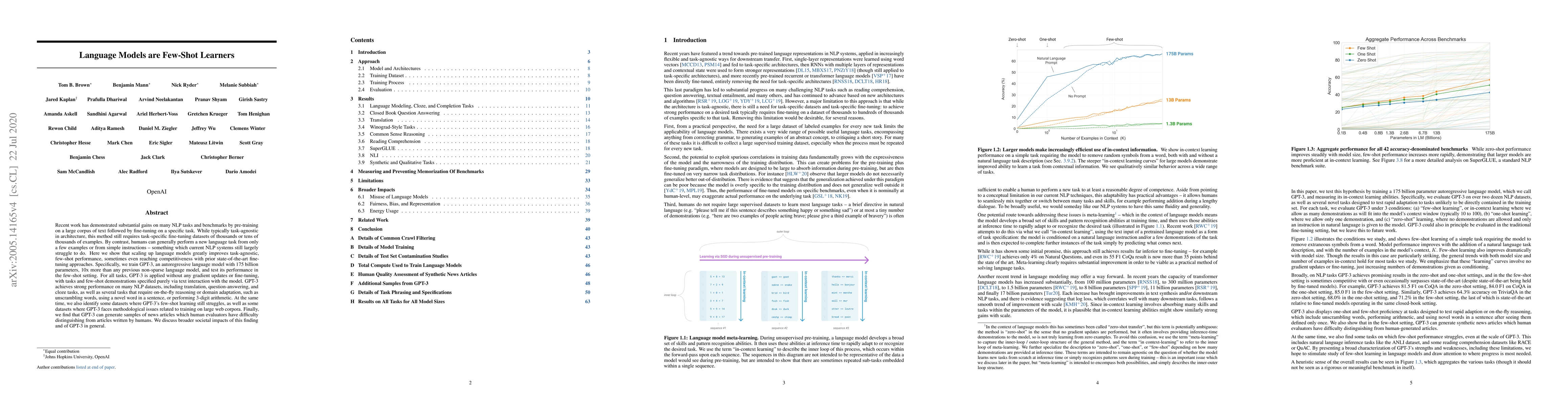 Recent work has demonstrated substantial gains on many NLP tasks and benchmarks by pre-training on a large corpus of text followed by fine-tuning on a specific task. While typically task-agnostic in architecture, this method still requires task-specific fine-tuning datasets of thousands or tens of thousands of examples. By contrast, humans can generally perform a new language task from only a few examples or from simple instructions - something which current NLP systems still largely struggle to do. Here we show that scaling up language models greatly improves task-agnostic, few-shot performance, sometimes even reaching competitiveness with prior state-of-the-art fine-tuning approaches. Specifically, we train GPT-3, an autoregressive language model with 175 billion parameters, 10x more than any previous non-sparse language model, and test its performance in the few-shot setting. For all tasks, GPT-3 is applied without any gradient updates or fine-tuning, with tasks and few-shot demonstrations specified purely via text interaction with the model. GPT-3 achieves strong performance on many NLP datasets, including translation, question-answering, and cloze tasks, as well as several tasks that require on-the-fly reasoning or domain adaptation, such as unscrambling words, using a novel word in a sentence, or performing 3-digit arithmetic. At the same time, we also identify some datasets where GPT-3's few-shot learning still struggles, as well as some datasets where GPT-3 faces methodological issues related to training on large web corpora. Finally, we find that GPT-3 can generate samples of news articles which human evaluators have difficulty distinguishing from articles written by humans. We discuss broader societal impacts of this finding and of GPT-3 in general.