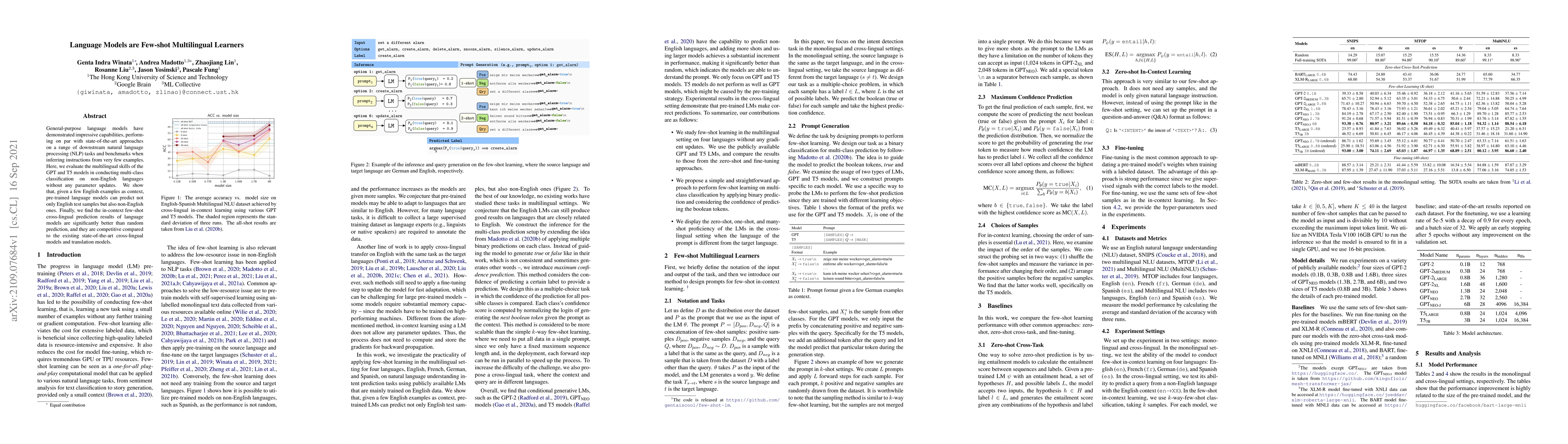 This paper evaluates the few-shot multilingual learning capabilities of pretrained language models like GPT and T5, demonstrating their ability to perform multi-class classification on non-English languages using only a few English examples. The results show that these models achieve competitive cross-lingual prediction performance compared to state-of-the-art methods without any parameter updates.