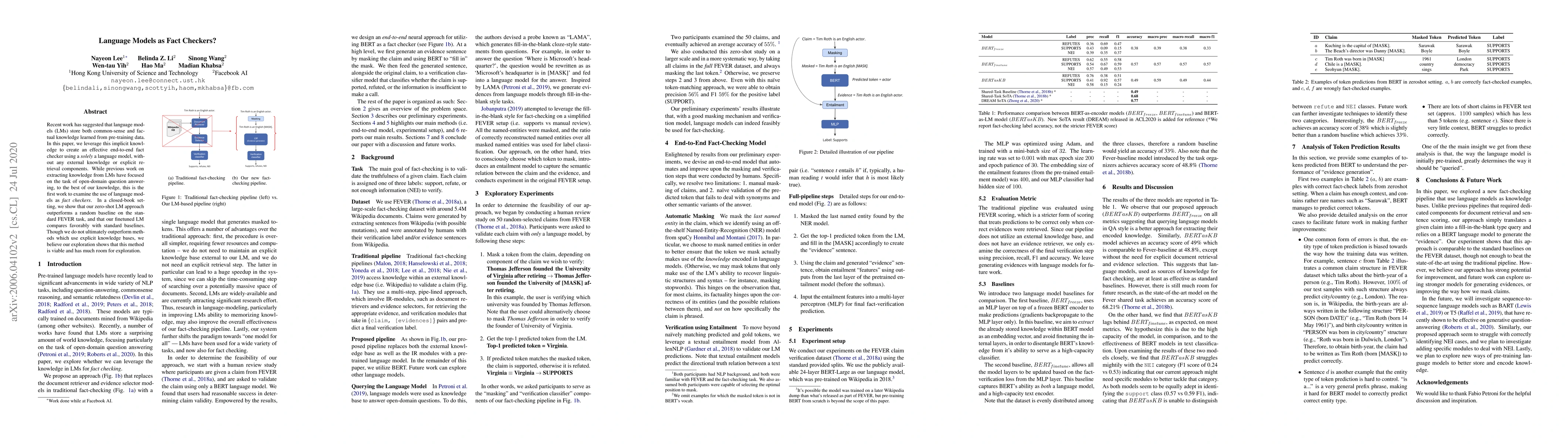 The paper proposes an end-to-end fact-checking approach using a language model, specifically BERT, without relying on external knowledge bases or retrieval components. The method involves masking tokens in claims and using the language model to predict the masked tokens, which are then used to classify the claim as supported, refuted, or not enough information (NEI).