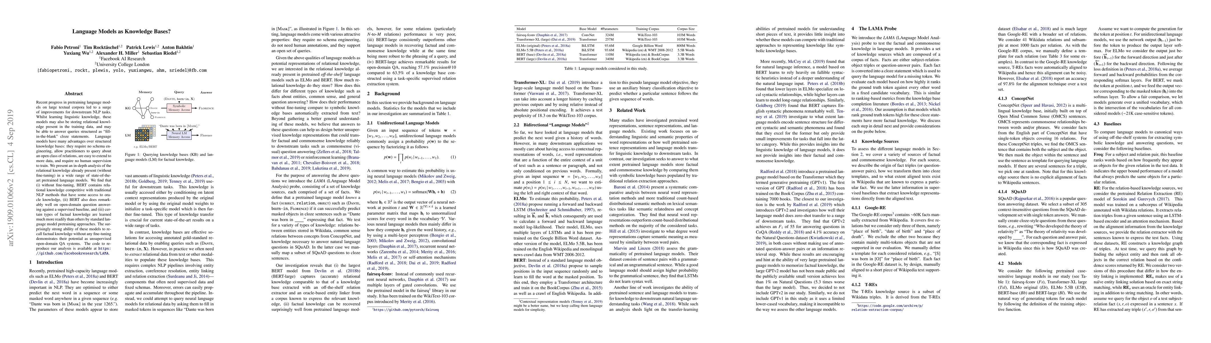 This paper investigates whether large pretrained language models, like BERT, can serve as effective knowledge bases by storing relational knowledge from their training data. It finds that BERT can answer factual queries and perform competitive relational knowledge tasks without fine-tuning, highlighting its potential as an unsupervised open-domain question-answering system.