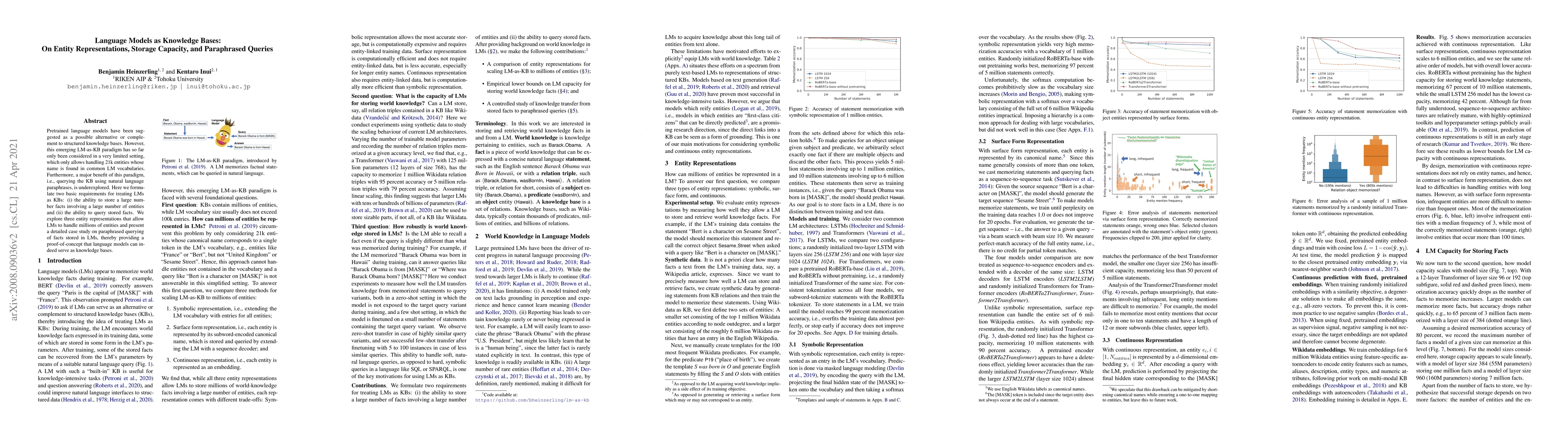 This paper explores how pretrained language models can function as knowledge bases by addressing their capacity to store and query large numbers of facts involving millions of entities. It proposes three entity representations and demonstrates the potential of language models to handle paraphrased queries, offering a proof-of-concept for their use as knowledge bases.